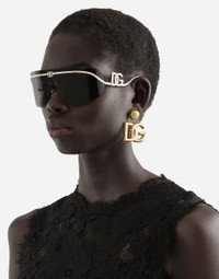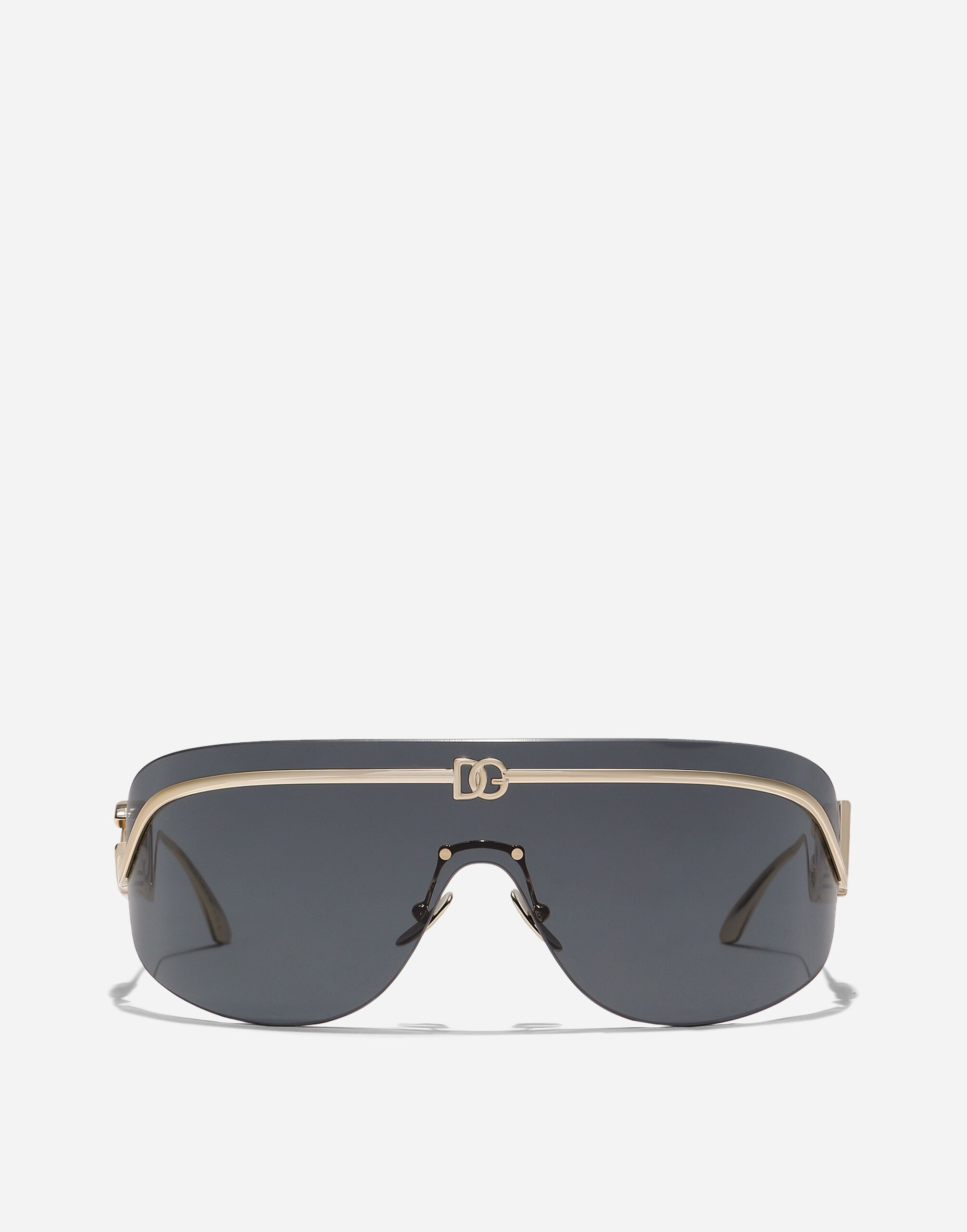 Shield design characterized by modern elegance and refined details. A sleek metal insert on the front creates a continuous connection with the temples where the DG crossed logo is perfectly integrated. • Gold metal frame • Gold metal temples • Dark grey lenses • 100% UV protection • Size lens - bridge - temple: 40 - 115 mm • Fitting: Adjustable nosepads • Packaging: Institutional • Made in Italy