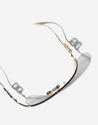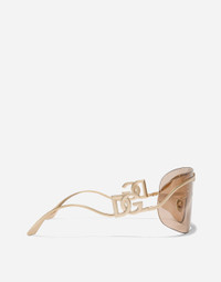 Shield design characterized by modern elegance and refined details. A sleek metal insert on the front creates a continuous connection with the temples where the DG crossed logo is perfectly integrated. • Gold metal frame • Gold metal temples • Light brown lenses • 100% UV protection • Size lens - bridge - temple: 40 - 115 mm • Fitting: Adjustable nosepads • Packaging: Institutional • Made in Italy
