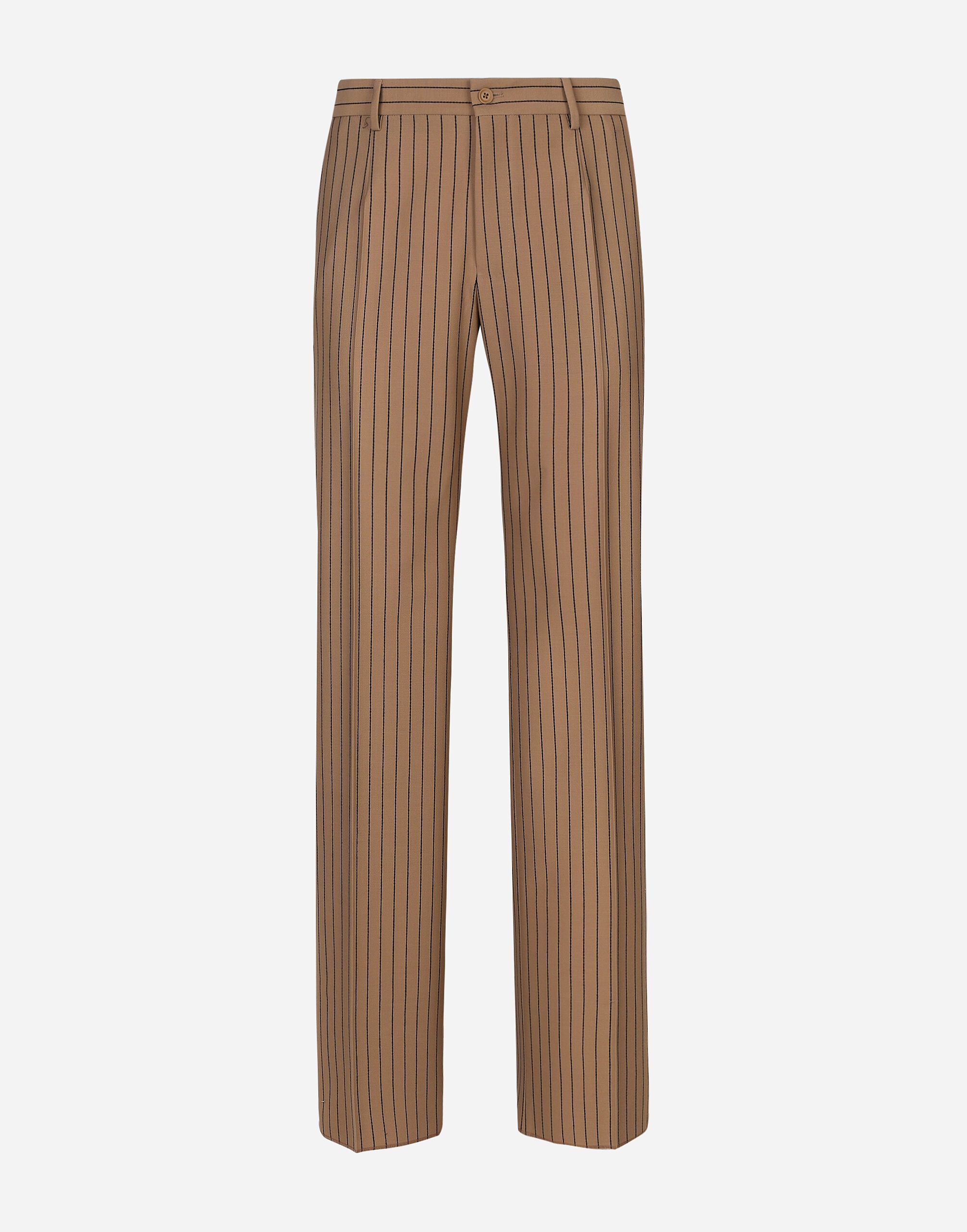 The SS24 “Stile” Collection recounts and clearly presents a strong concept: the unique and unmistakable style of Dolce&Gabbana. A word that is more than a statement. It is a concept! The designers work with surfaces, textures, layers and color nuances, as well as the sheen and fineness of the materials themselves, creating a “Stylish” collection. We’re going back to our roots with the desire to reaffirm the “Stile” - style -, flair and iconic DNA of the brand. Tailored virgin wool pinstripe pants with a straight leg: • Beige • Regular fit • Belt loops on the waist • Fly-covered zipper and button fastening • Front slant pockets and buttoned welt pockets at the back • The item measures 120 cm on the outer leg and the hem is 28 cm wide on a size IT 48 • Made in Italy External composition: 100% Virgin Wool