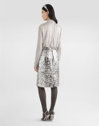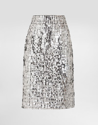 Elegance, tailored lines and sparkling details define the Dolce&Gabbana Holiday collection. Sixties inspirations blend with a contemporary aesthetic. For him, structured jackets and cuts that enhance the silhouette for her, silver brocade and crystals illuminate festive looks. Each piece stands out for its fine materials, attention to detail and distinctive style. This sequined straight skirt is an iconic piece that adds a touch of glamour and sophistication to any outfit. Perfect for an elegant evening or a special event, its clean line and careful details make it a unique piece in every woman's wardrobe. Straight skirt with sequins: • Silver • With high belt • Slit at the center back • Covered zip closure at the center back • Lined • Length is 60 cm on size 40 IT • Made in Italy External composition: 100% Polyester Internal composition: 92% Silk, 8% Elastane