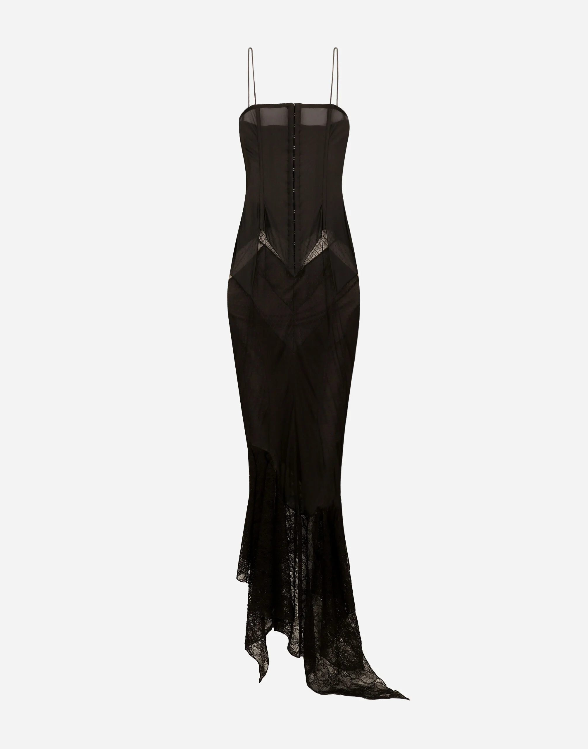 Strapless lace patchwork dress: • Black • Straight neckline • Sleeveless with spaghetti straps • Stretch silk crepe de chine slip • Rear zipper and hook-and-eye fastenings • The piece measures 120 cm from the center back of the neck on a size IT 40 • The model is 175 cm tall and wears a size IT 40 • Made in Italy Care And Details External composition: 77% Polyamide 18% Viscose 3% Silk 2% Spandex Internal composition: 91% Silk 9% Spandex