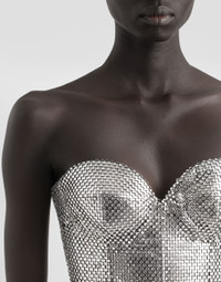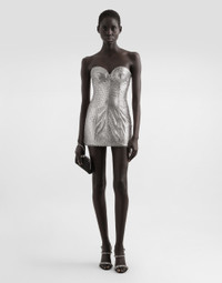 In the Fall/Winter 2025 Fashion Show Collection, shearling jackets, in fur-free versions, reveal slip dresses and create contrast' plays while denim welcomes fabric or Leo print inserts. Sweatshirts are the result of long experimentation with volumes. Evening looks become precious thanks to dresses with special embroideries and luminous touches of sequins and crystals. Sheepskin inserts also unite hats, shoes, and bags, including those with pockets. This strapless dress is an example of sophisticated elegance, perfect for special occasions. The innovative design and the use of fine materials make it a unique garment that enhances the female silhouette with a touch of glamour. Strapless mesh dress: • Silver • Internal base with cups • Concealed back zip • Waist length 40 cm on size 40 IT • The model is 175 cm tall and wears size 40 IT • Made in Italy External Composition: 97% Polyester, 3% Elastane Internal Composition: 92% Silk, 8% Elastane