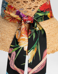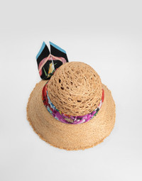 This straw hat is the perfect accessory to add a touch of elegance and style to your summer look. Straw hat: • Multi-coloured • With hand-sewn floral bandeau with knot on the center back • Made in Italy External Composition: 85% Raffia, 15% Silk