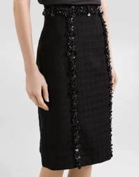 This pencil skirt represents timeless elegance, perfect for enhancing the feminine silhouette with a touch of sophistication. Ideal for a formal look or a special occasion, thanks to its detailed workmanship and embroidered edges. Stretch mat sheath skirt: • Black • Zip at the center back • Embroidered edges at the hem of the waistband and on the front cuts • Doubled with tulle • Length 60 cm from the waist on size 40 IT • The model is 175 cm tall and wears size 40 IT • Made in Italy External Composition: 97% Virgin Wool, 2% Polyamide, 1% Elastane Internal Composition: 100% Polyamide