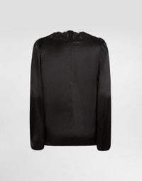 In the Fall/Winter 2025 Fashion Show Collection, shearling jackets, in fur-free versions, reveal slip dresses and create contrast' plays while denim welcomes fabric or Leo print inserts. Sweatshirts are the result of long experimentation with volumes. Evening looks become precious thanks to dresses with special embroideries and luminous touches of sequins and crystals. Sheepskin inserts also unite hats, shoes, and bags, including those with pockets. This black stretch satin blouse is a versatile and refined garment, ideal for completing any look with a touch of elegance. Stretch satin blouse: • Black • With lace on the front neckline that continues on the back shoulder • Zip opening at the center back • The model is 175 cm tall and wears size 40 IT • Made in Italy External Composition: 88% Silk, 7% Cotton, 3% Polyamide, 2% Elastane