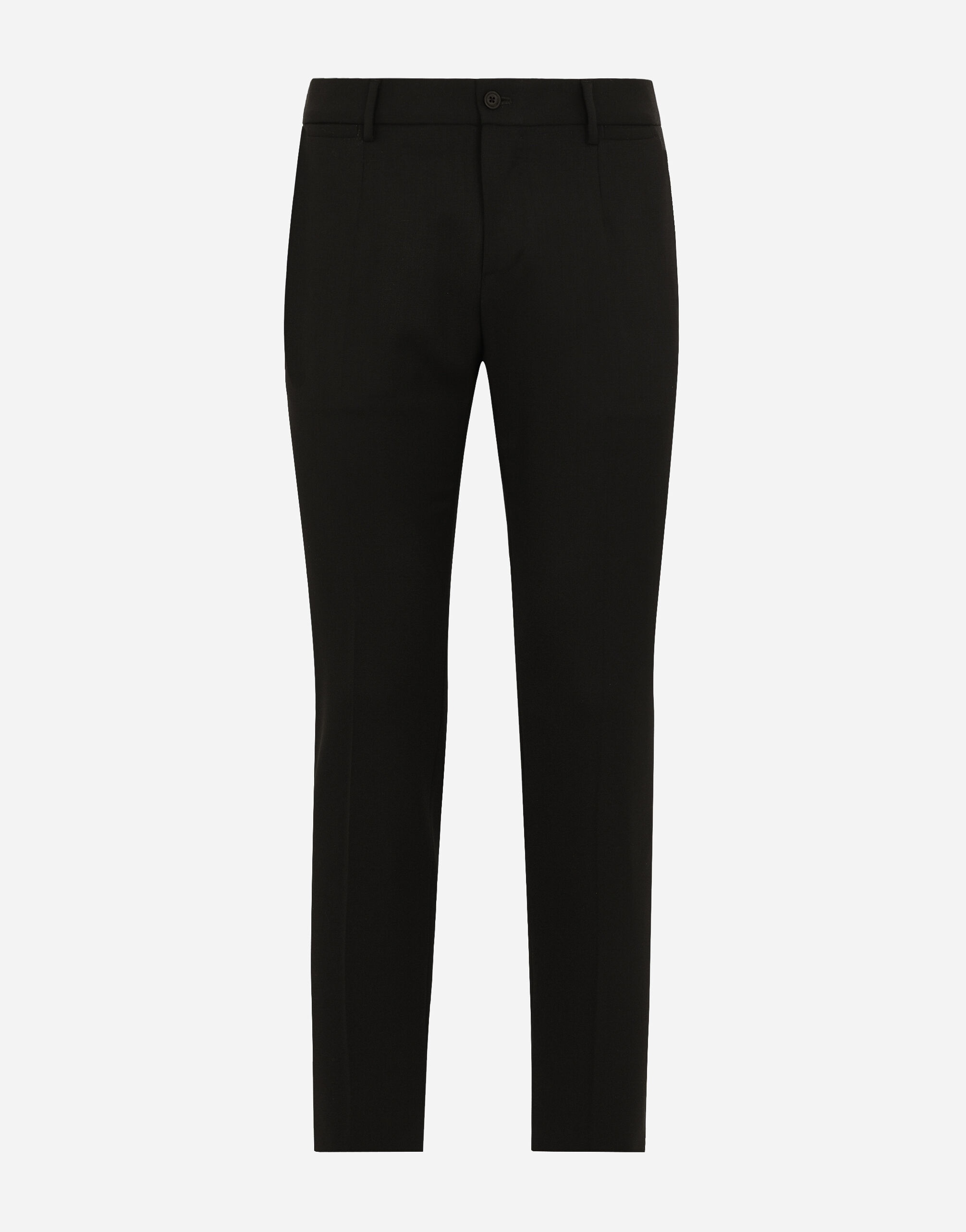 Tailored stretch wool twill pants: • Black • Regular fit • Belt loops on the waist • Fly-covered zipper and button fastening • Front slant pockets and buttoned welt pockets at the back • The item measures 115.5 cm on the outer leg and the hem is 17.5 cm wide on a size IT 48 • Made in Italy Dolce & Gabbana accessories have been created for the man who loves those little stylish details that make all the difference. External composition: 97% Wool 3% Spandex