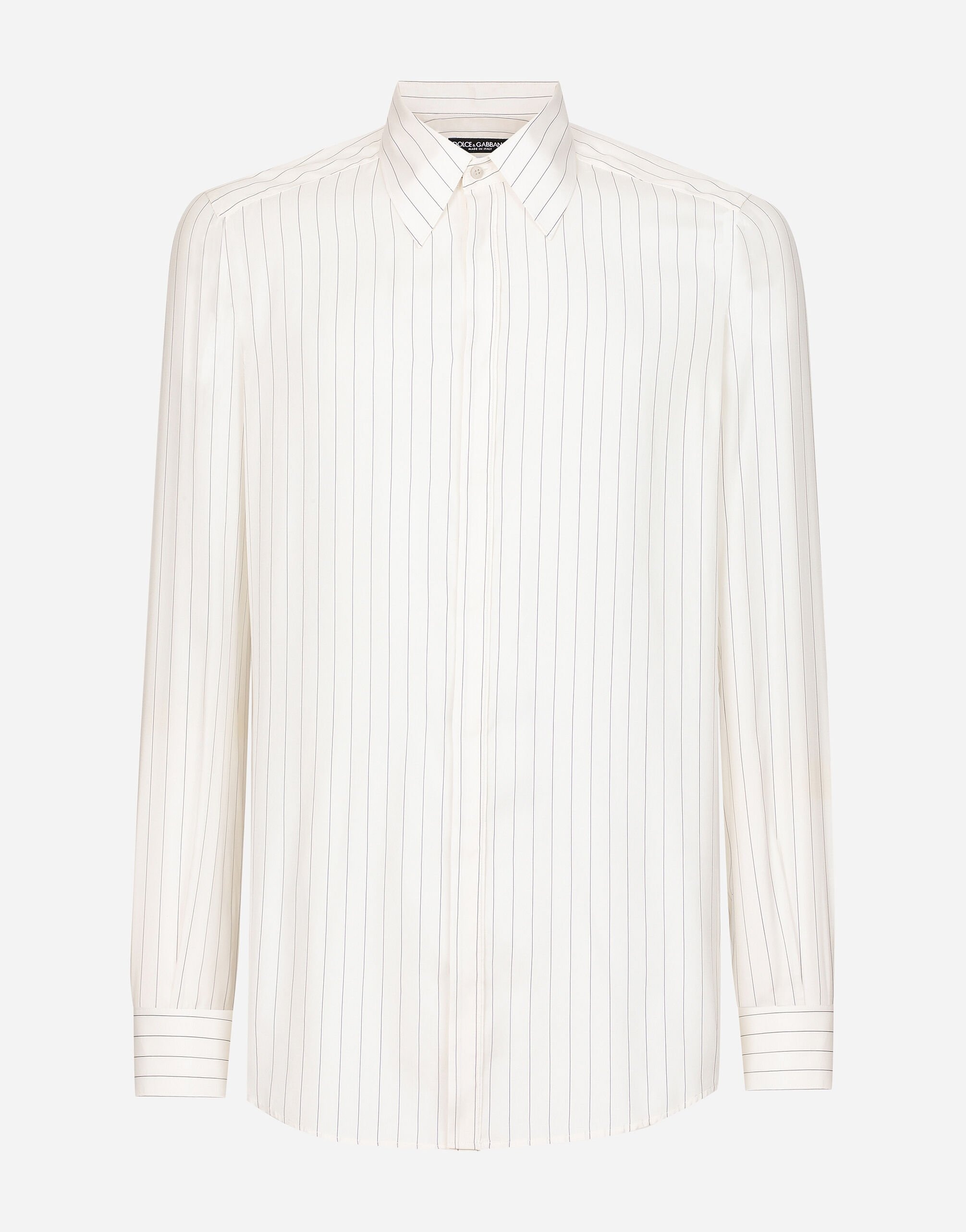 Tailoring means beauty, proportions, skilled cuts and sophisticated details. The FW 24-25 Sartoriale Collection builds on this solid foundation to define new ways of pairing colors, materials and textures.Sicilian rock gray envelops different textures, while Nero Sicilia black adorns textile and velvet weaves and camel pairs with orange. Various types of pinstripes, textured-effect cashmere, double fabrics, suede and denim meet in the looks. Striped silk poplin shirt: • White • Regular Martini fit • Kent collar • Long sleeves • Covered button placket fastening • Rear yoke with inverted pleat on hem • The piece measures 80 cm from the rear collar seam on a size IT 40 • Made in Italy External composition: 100% Silk