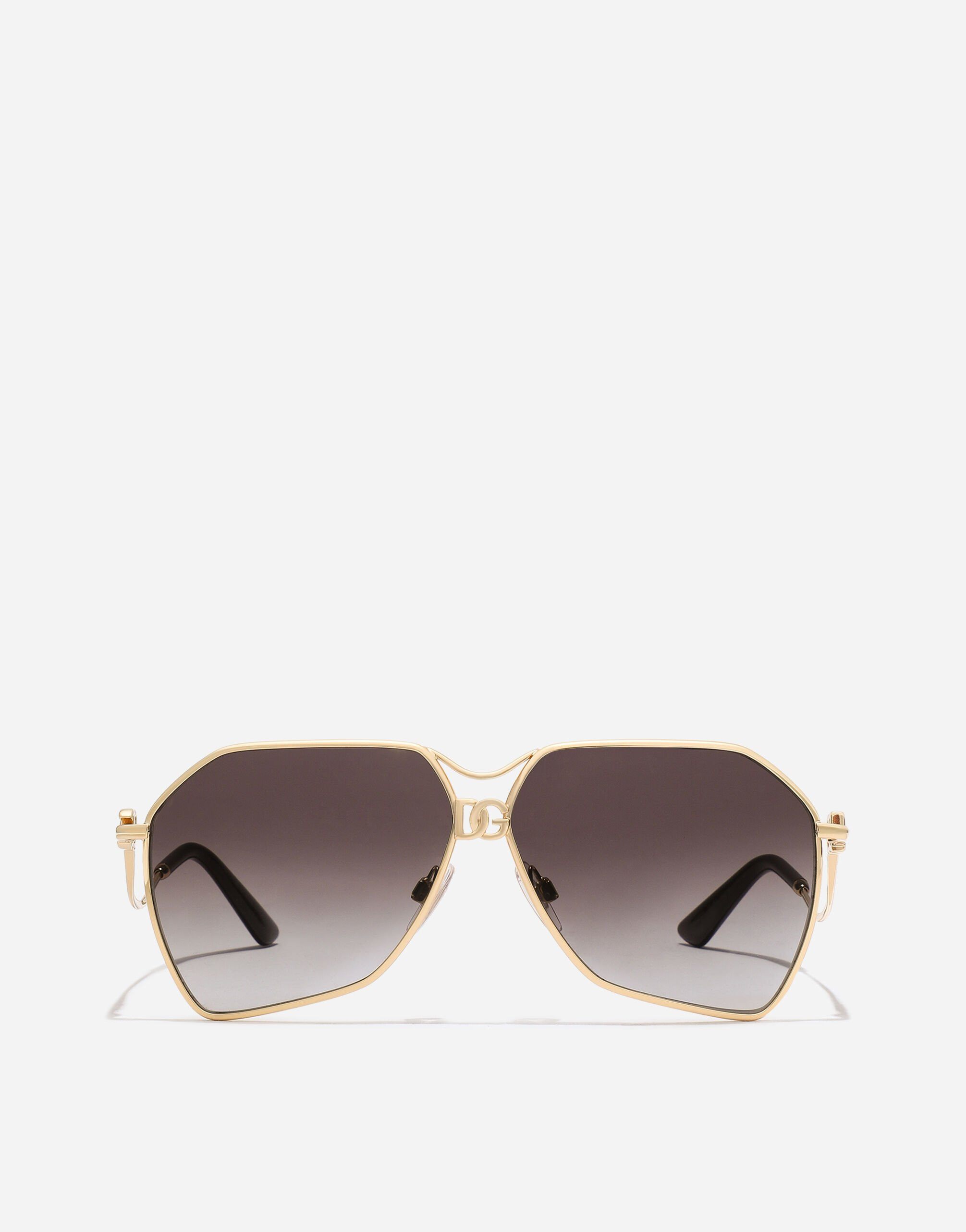Contemporary geometric pilotmodel with DG crossed logo integrated on front and wavy metal temples • Gold metal frame • Gold metal temples • Grey gradient black lenses • 100% UV protection • Size bridge- temple- lenses: 10- 145 - x • Fitting: Adjustable nosepads • Packaging: Institutional • Made in Italy