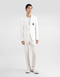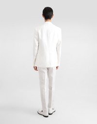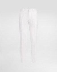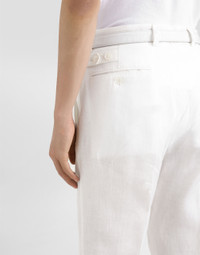 The Italian Holiday Men's Collection revisits 1950s style with a blend of relaxed fits and modern flair. Classic white shirts and tailored suits in refined fabrics contrast with casual denim and playful T-shirts featuring retro graphics with a futuristic twist. Bold prints—chessboards, cats, elegant lighters, and Mediterranean blue ribbons—alongside logo jacquard inspired by ties, infuse a contemporary edge into the essence of Italian holidays. Tailored linen pants: • White • Regular fit • Belt loops on the waist • Fly-covered zipper and button fastening • 2-button straps on hips • Front slant pockets and buttoned welt pockets at the back • The item measures 105 cm on the outer leg and the hem is 22 cm wide on a size IT 48 • Made in Italy External composition: 100% Linen