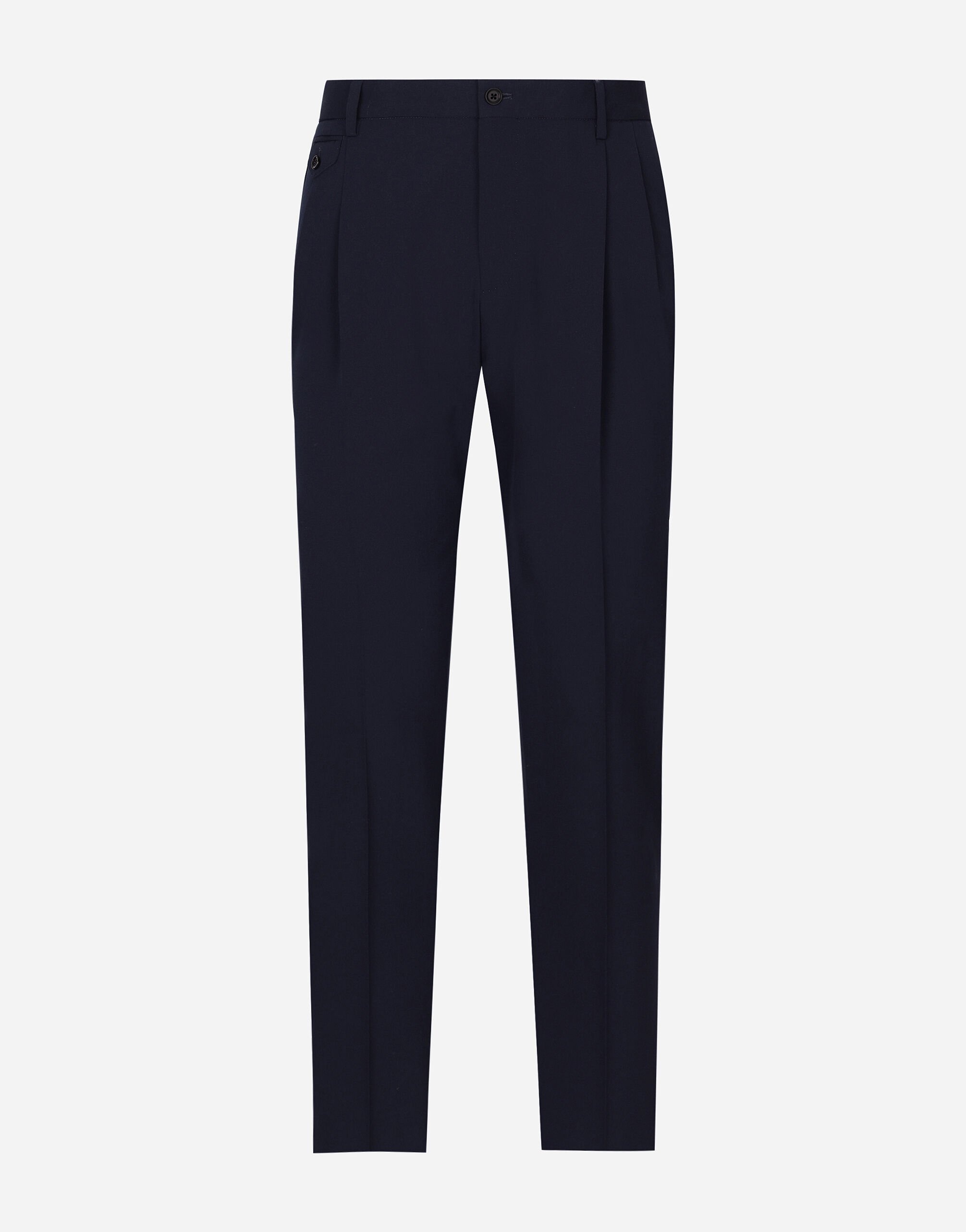 Tailoring means beauty, proportions, skilled cuts and sophisticated details. The FW 24-25 Sartoriale Collection builds on this solid foundation to define new ways of pairing colors, materials and textures. Sicilian rock gray envelops different textures, while Nero Sicilia black adorns textile and velvet weaves and camel pairs with orange. Various types of pinstripes, textured-effect cashmere, double fabrics, suede and denim meet in the looks. Tailored stretch twill pants: • Blue • Regular fit • Belt loops on the waist • Fly-covered zipper and button fastening • Double darts • Front slant pockets, a coin pocket, and buttoned welt pockets on the back • The item measures 105.5 cm on the outer leg and the hem is 18 cm wide on a size IT 48 • Made in Italy External composition: 98% Virgin Wool 2% Spandex