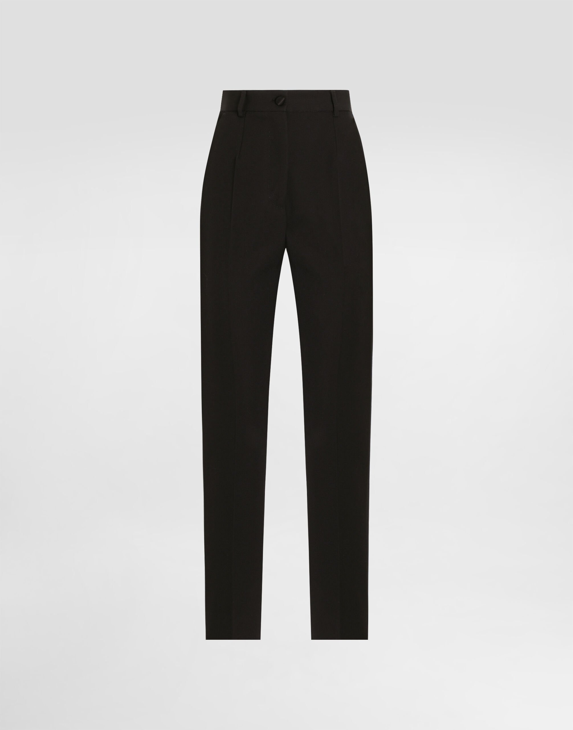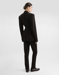 The Spring/Summer 2025 Women’s Collection is celebrating Italian beauty through bold and charismatic femininity. The 50s-inspired lingerie is the star, intermingling with fitted dresses, corsets and oversize trench coats. The iconic jackets have been updated with cropped cuts and modern inserts, while the floral prints add a romantic edge. The eveningwear shines with light fabrics and crystals, accompanied by look-defining accessories, from iconic bags to the cross earrings. Tailored woolen tuxedo pants: • Black • Dolce high waist • Front slant pockets • Welt back pockets • Belt loops • Inner leg: 74 cm • Hem: 17 cm • Zipper and covered button fastening • The model is 175 cm tall and wears a size IT 40 • Made in Italy External composition: 85% Virgin Wool 12% Silk 03% Polyester