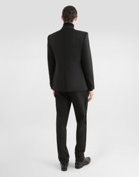 Elegant tailored three-piece stretch wool tuxedo suit with silk satin details: • Slim Sicilia fit • Jacket with peak lapels, welt pockets, a breast pocket, three inner pockets and central vent • Single-breasted fastening with a double button, lined • V-neck vest with five buttons • Pants with front slant pockets, rear buttoned welt pockets and satin side bands • The jacket measures 73.5 cm from the back collar seam on a size IT 48 • The pants measure 115 cm on the outer leg and the hem is 17.5 cm wide on a size IT 48 • The model is 185 cm tall and wears a size IT 48 • Made in Italy Care And Details External composition: 88% Wool 7% Silk 3% Spandex 2% Polyester Internal composition: 100% Viscose