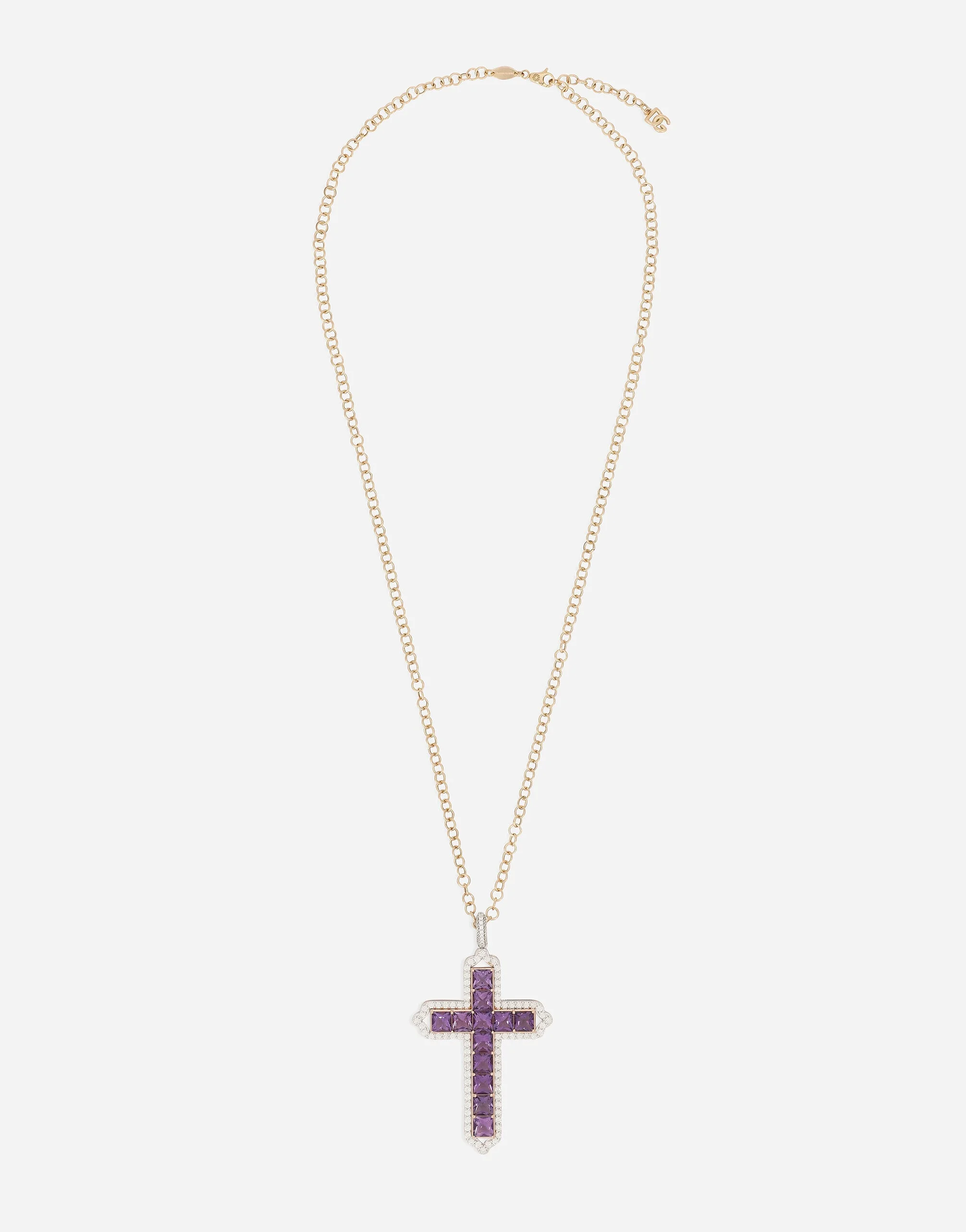 Cross pendant in rose and white gold with amethysts and diamonds. The DG cross logo enriche the end of the adjustable chain in yellow gold. Technical specification: 18 Kt rose and white gold Lenght: 60 cm Cross Measure: 6 cm Gemological details: 12 amethysts (quartz variety): transparent, purple colour, square shape, princess cut; total weight: 11.67 cts; 92 diamonds: transparent, colourless, round shape, brilliant cut; total weight: 2.51 cts; clarity: VVS – VS; colour: D – G. Made in Italy yellow gold, white gold