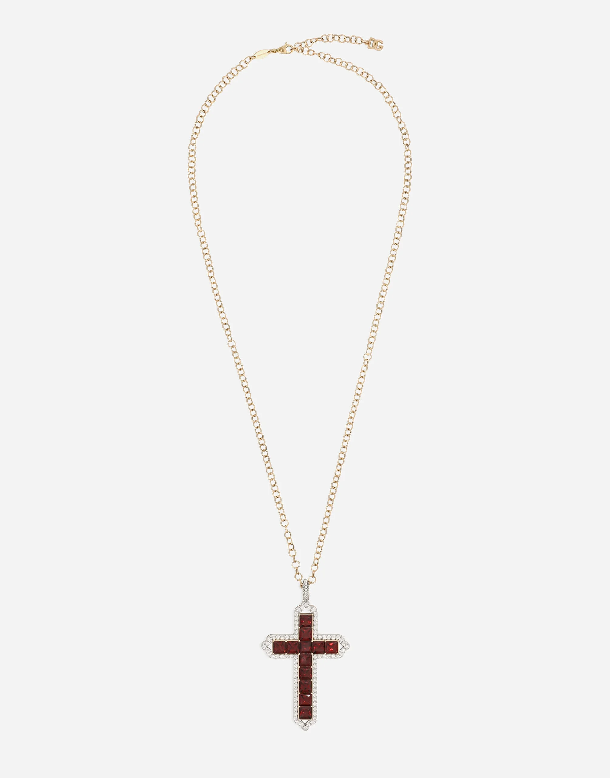 Cross pendant in yellow and white gold with garnets and diamonds. Technical specification: 18 Kt yellow and white gold Cross Measure: 6 cm Gemological details: 12 garnets: transparent, red colour, square shape, princess cut total weight: 14.72 cts 92 diamonds: transparent, colourless, round shape, brilliant cut total weight: 2.51 cts clarity: VVS – VS colour: D – G. Made in Italy yellow gold, white gold