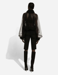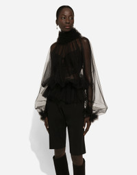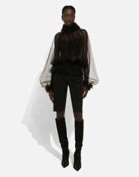 In the “WOMAN SS 24” Collection, the imagery of old Sicily interacts with the masculine, with sensual shapes, lace, nude tones and delicate overlays, to create pieces that move amid clean silhouettes, the elegance of the 1960s, the contrasts of black and white and luxurious textures. The designers are reworking their signature style and their iconic Sicilia black color to convey an aware, seductive and confident Sicilian WOMAN who is imbued with sensuality. Stretch tulle blouse with ruffles on the neck and cuffs: • Black • High neck • Long sleeves • Loose fit • Unlined • Stretch cuffs and hem • The piece measures 79 cm from the center back on a size IT 40 • The model is 175 cm tall and wears a size IT 40 • Made in Italy External composition: 100% Polyamide