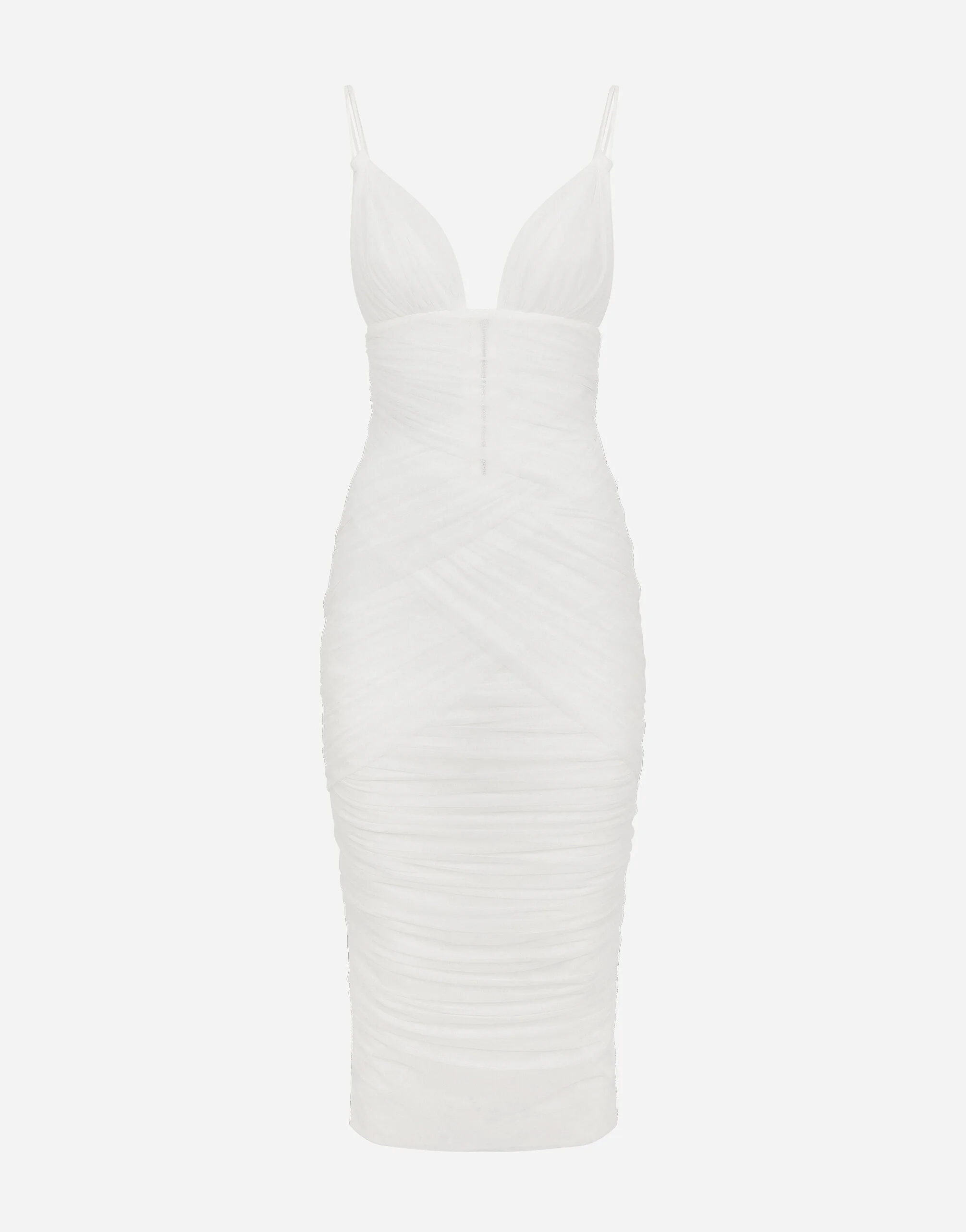 Stretch tulle draped calf-length dress: • White • Sweetheart neckline • Sleeveless with shoulder straps • Tulle lining • Rear zipper and hook-and-eye fastening • The piece measures 90 cm from the waist down on a size IT 40 • The model is 175 cm tall and wears a size IT 40 • Made in Italy Care And Details External composition: 80% Polyamide 20% Spandex Internal composition: 80% Polyamide 20% Spandex