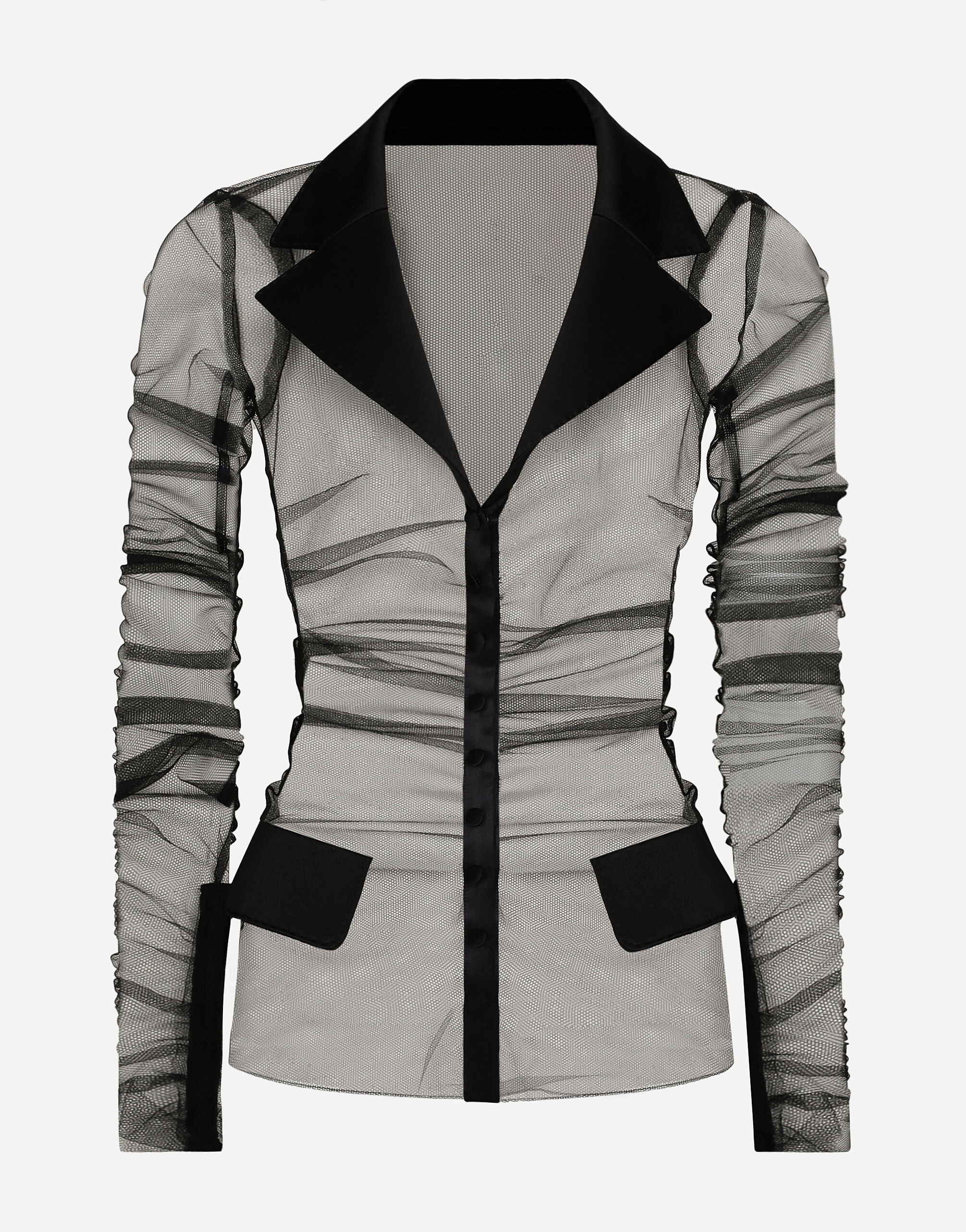 In the “WOMAN SS 24” Collection, the imagery of old Sicily interacts with the masculine, with sensual shapes, lace, nude tones and delicate overlays, to create pieces that move amid clean silhouettes, the elegance of the 1960s, the contrasts of black and white and luxurious textures. The designers are reworking their signature style and their iconic Sicilia black color to convey an aware, seductive and confident Sicilian WOMAN who is imbued with sensuality. Stretch tulle jacket with satin details: • Black • Satin peak lapels • Long sleeves • Slim fit • Faux flap pockets • Unlined • Covered button fastenings • The piece measures 63 cm from the center back on a size IT 40 • The model is 175 cm tall and wears a size IT 40 • Made in Italy External composition: 80% Polyamide 17% Silk 03% Polyester