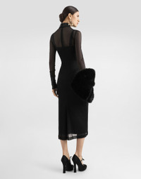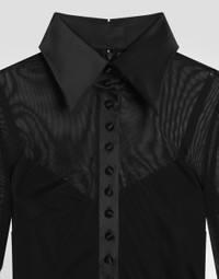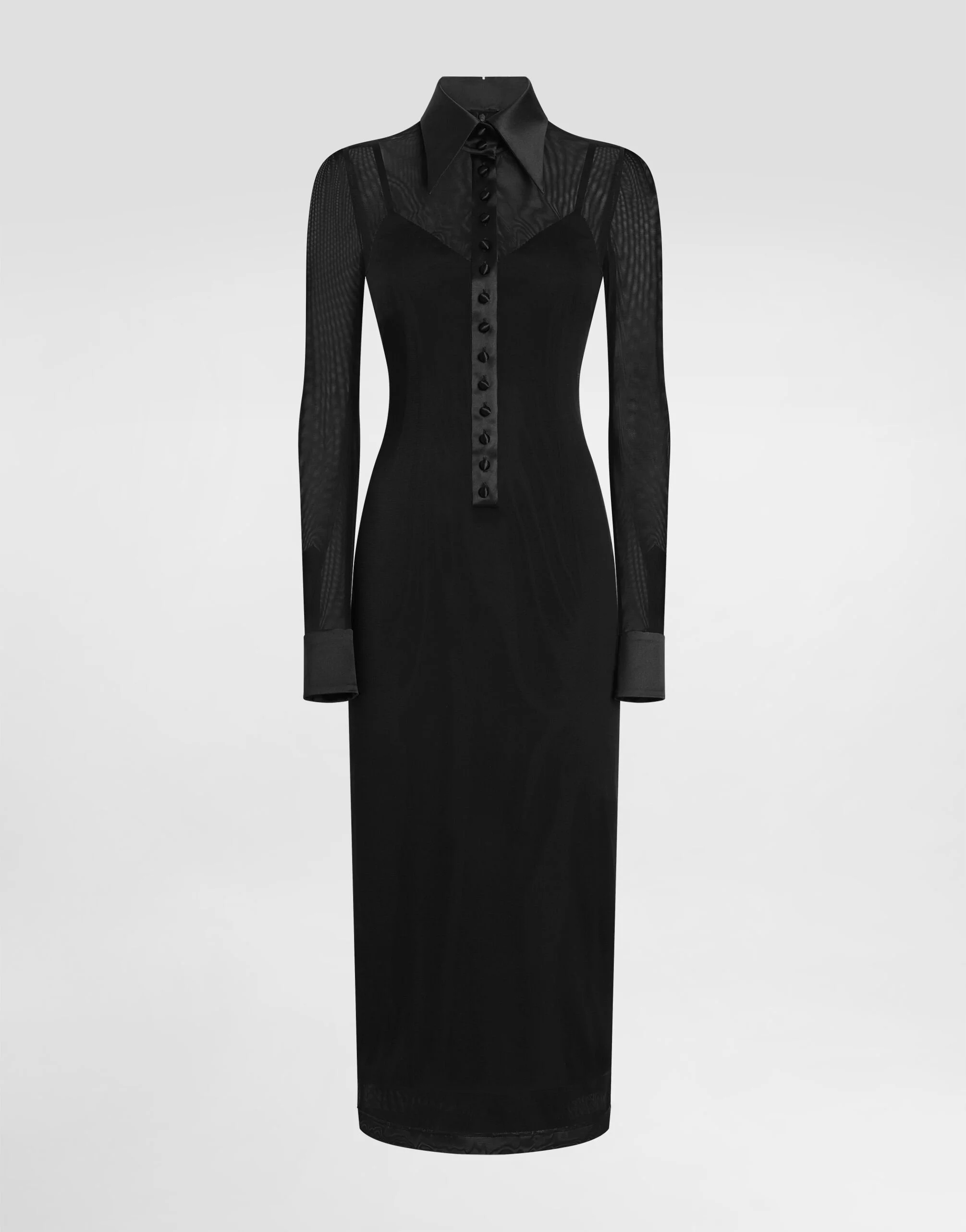 The Spring/Summer 2025 Women’s Collection is celebrating Italian beauty through bold and charismatic femininity. The 50s-inspired lingerie is the star, intermingling with fitted dresses, corsets and oversize trench coats. The iconic jackets have been updated with cropped cuts and modern inserts, while the floral prints add a romantic edge. The eveningwear shines with light fabrics and crystals, accompanied by look-defining accessories, from iconic bags to the cross earrings. Stretch tulle shirt dress with satin details: • Black • Satin shirt collar • Long sleeves with satin cuffs • Stretch silk crepe de chine slip • Rear zipper and hook-and-eye fastening • The piece measures 85 cm from the waist down on a size IT 40 • The model is 175 cm tall and wears a size IT 40 • Made in Italy External composition: 83% Polyamide 10% Silk 7% Spandex Internal composition: 91% Silk 9% Spandex