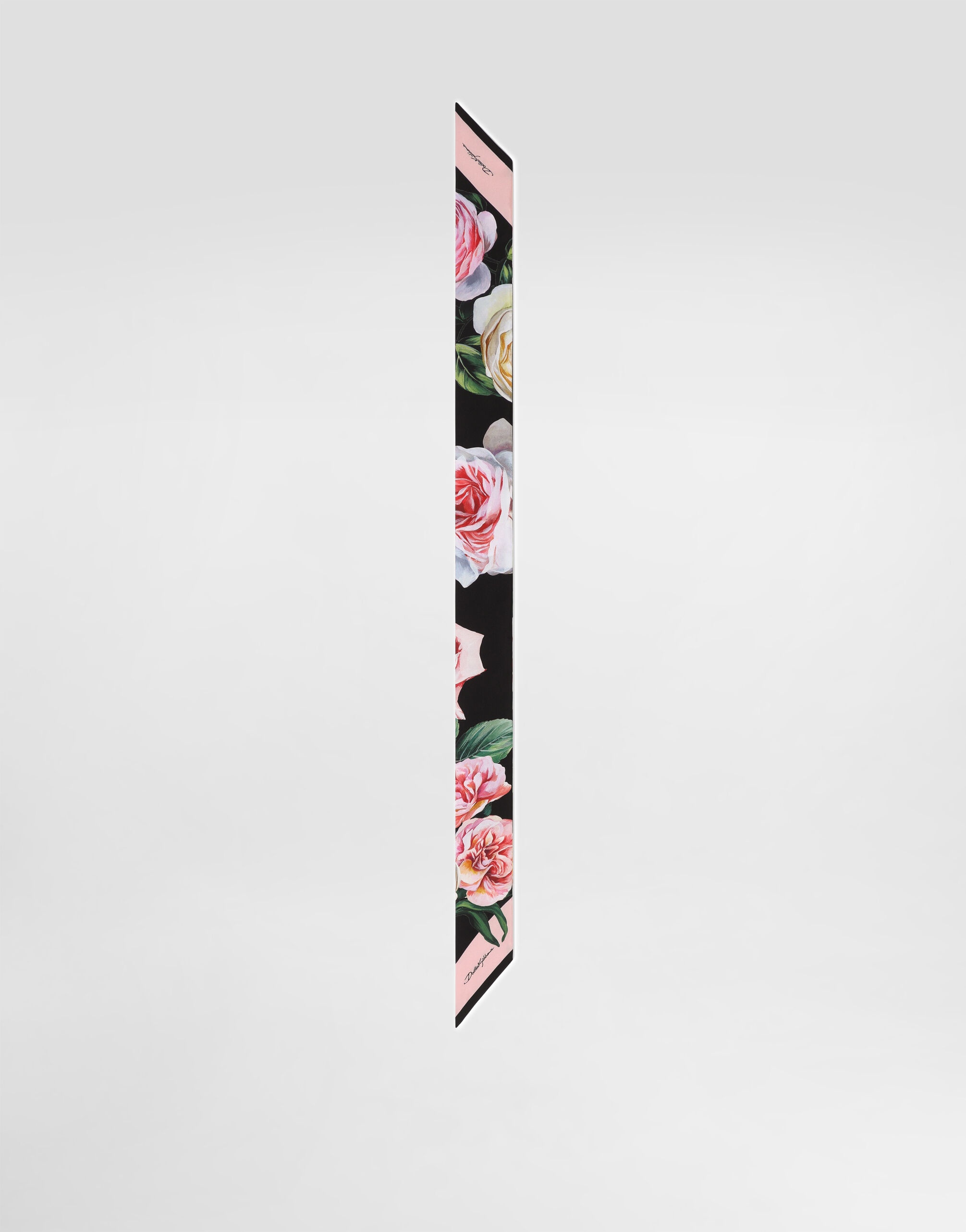 The Women's Black Sicily Collection reinforces Dolce&Gabbana's iconic fabrics and codes rooted in Italian heritage. Sensual silhouettes, highlighted by floral prints and refined corsetry, evoke an intriguing elegance, while the iconic black lace, satin, and velvet dominate the collection. Denim in various shades of blue introduces a contemporary twist, balancing the classic and modern. Embroidered crosses, medals, and jewelry add a sophisticated touch. Silk twill headscarf with peony and rose print: • Multi-colored • “Dolce&Gabbana” logo • Measurements: 6 x 100 cm • Made in Italy The difference in the print placement that you may find on this product is a feature of Dolce&Gabbana’s “Handmade” pieces. A detail that makes every garment or accessory unique and exclusive. External composition: 100% Silk