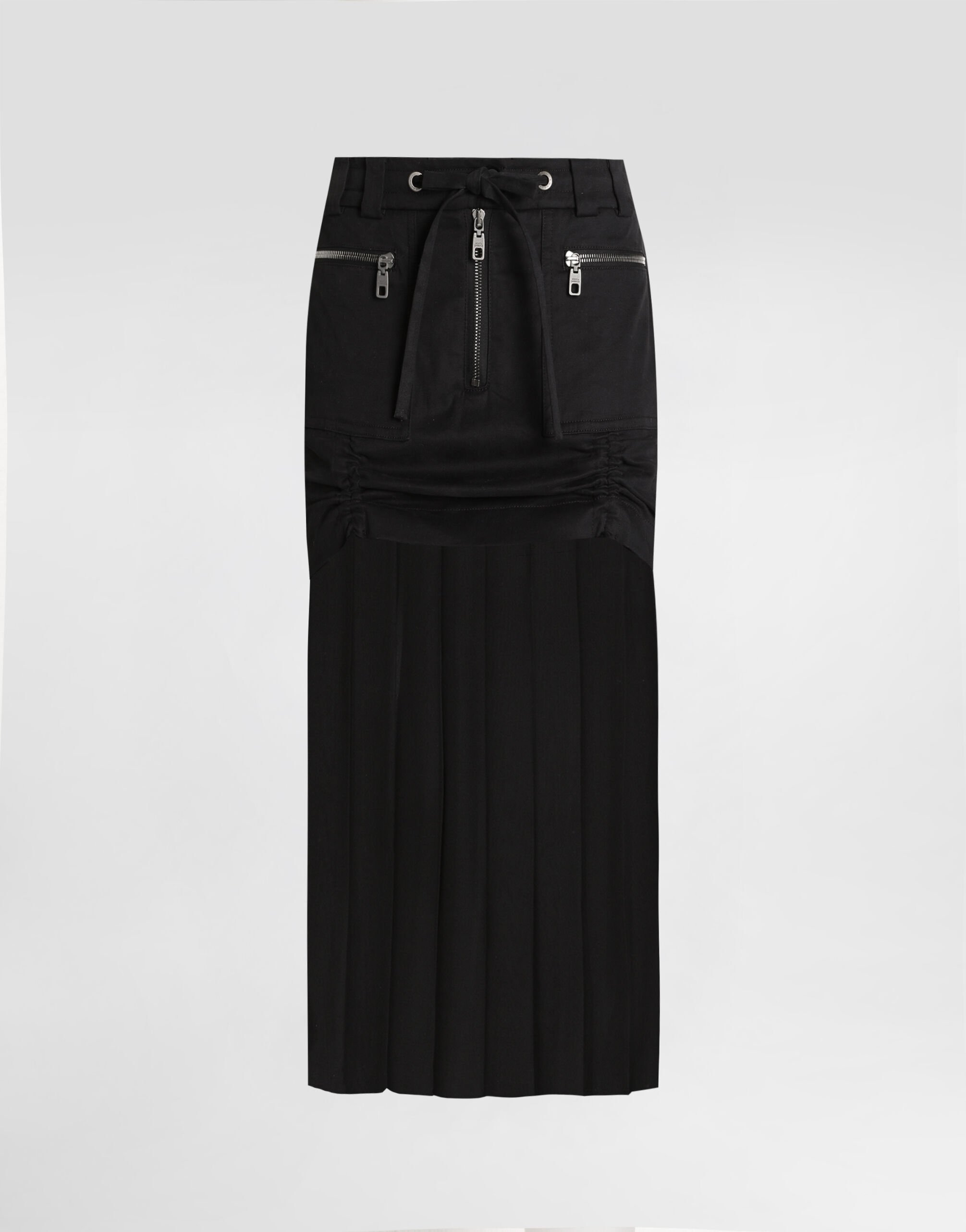In the Fall/Winter 2025 Fashion Show Collection, shearling jackets, in fur-free versions, reveal slip dresses and create contrast' plays while denim welcomes fabric or Leo print inserts. Sweatshirts are the result of long experimentation with volumes. Evening looks become precious thanks to dresses with special embroideries and luminous touches of sequins and crystals. Sheepskin inserts also unite hats, shoes, and bags, including those with pockets. This skirt is an example of modern elegance, combining fine fabrics and innovative details. Perfect for those looking for a versatile and fashionable garment. Twill midi skirt with chiffon: • Black • With twill basque and patch pockets • Visible zippers • Single-profile pockets with buttonhole and button fastening • Visible zipper opening in the center front with visible chain • 4.7 cm high belt with stitching and drawstring passage • Vertical drawstring motif in the bottom • Length skirt including belt 85 cm on size 40 IT • The model is 175 cm tall and wears size 40 IT • Made in Italy External Composition: 70% Silk, 28% Cotton, 2% Elastane