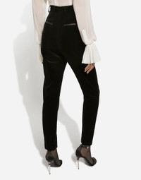 In the “WOMAN SS 24” Collection, the imagery of old Sicily interacts with the masculine, with sensual shapes, lace, nude tones and delicate overlays, to create pieces that move amid clean silhouettes, the elegance of the 1960s, the contrasts of black and white and luxurious textures. The designers are reworking their signature style and their iconic Sicilia black color to convey an aware, seductive and confident Sicilian WOMAN who is imbued with sensuality. Velvet cigarette pants: • Black • High-waisted • Front slant pockets • Welt back pockets • Inner leg: 73 cm • Hem: 15 cm with invisible zipper • Zipper and button fastening • The model is 175 cm tall and wears a size IT 40 • Made in Italy External composition: 95% Cotton 02% Polyester 03% Silk