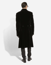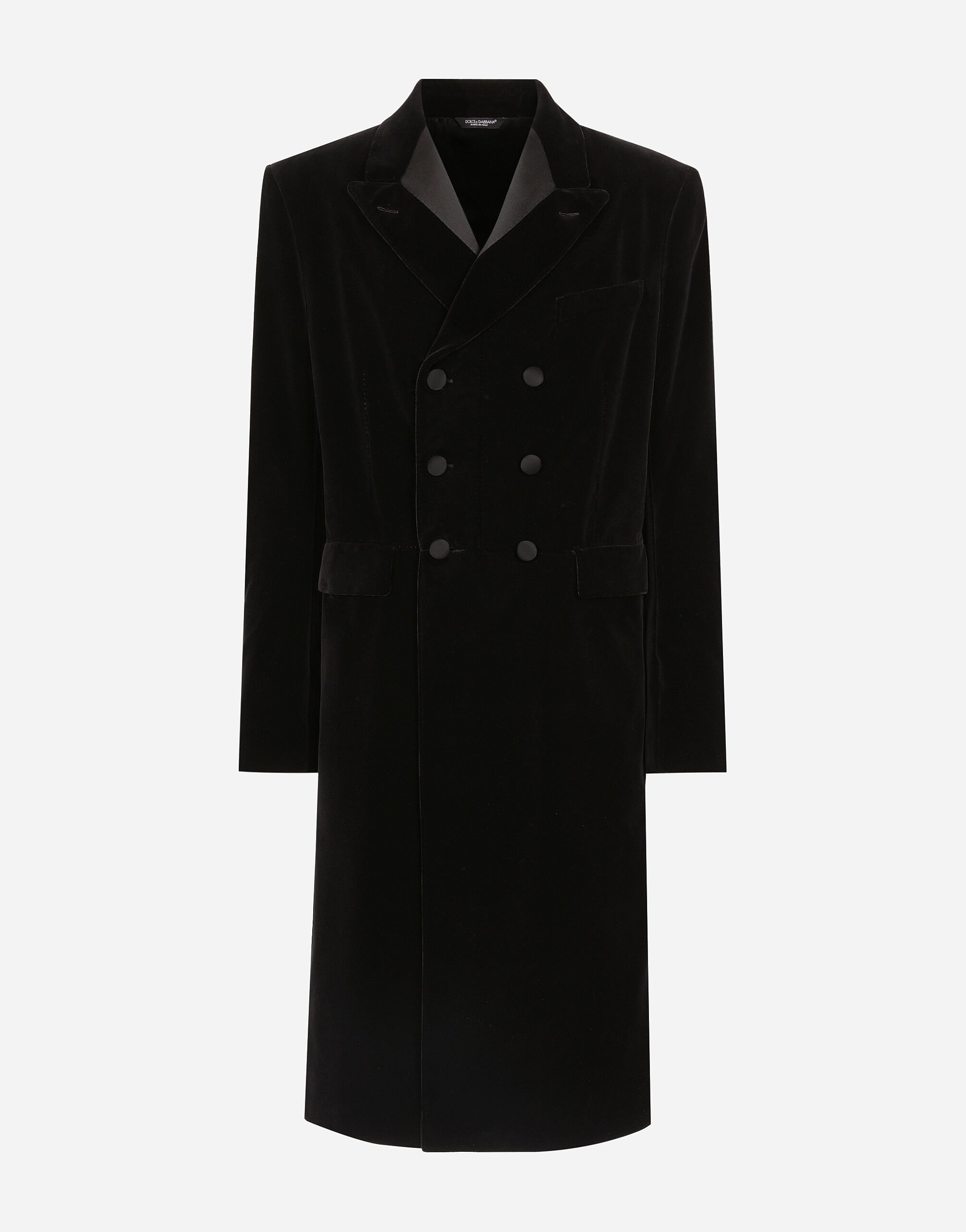 Contemporary men’s formalwear: The FW 24/25 Dolce&Gabbana Men’s Collection is embracing the concept of absolute elegance dominated by the iconic Nero Sicilia black. The daywear of the Dolce&Gabbana man comes to life through the outerwear that comes in a range of lengths and the slim-fit pants. For nightwear, the look becomes scintillating thanks to sequined embellishment and stone appliques. This refined taste can also be seen on the accessories, such as on the slip-ons with hand-applied organza flower accent and the new clutch. Smooth cotton velvet coat with inlaid frock coat cut and satin details: • Black • Regular fit • Double-breasted fastening with buttons • Lined • Deep vent on the back • The piece measures 117 cm from the rear collar seam on a size IT 48 • Made in Italy External composition: 91% Cotton 5% Silk 3% Virgin Wool 1% Polyester Internal Composition: 100% Silk