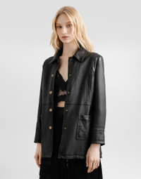 In the Fall/Winter 2025 Fashion Show Collection, shearling jackets, in fur-free versions, reveal slip dresses and create contrast' plays while denim welcomes fabric or Leo print inserts. Sweatshirts are the result of long experimentation with volumes. Evening looks become precious thanks to dresses with special embroideries and luminous touches of sequins and crystals. Sheepskin inserts also unite hats, shoes, and bags, including those with pockets. This vintage leather jacket is an iconic piece that is ideal for adding a touch of elegance and sophistication to your wardrobe. With meticulous details and fine workmanship, it is perfect for those who like to stand out in style. Vintage Lambskin single-breasted jacket: • Black • Double bezel collar • With waist cut • Patch pocket at waist • With snap buttons • Hem with high cuff fastened with snap button • Patch pocket at waist • Quilted lining • The model is 175 cm tall and wears size 40 IT • Made in Italy External Composition: 100% Lambskin Internal Composition: 100% Viscose