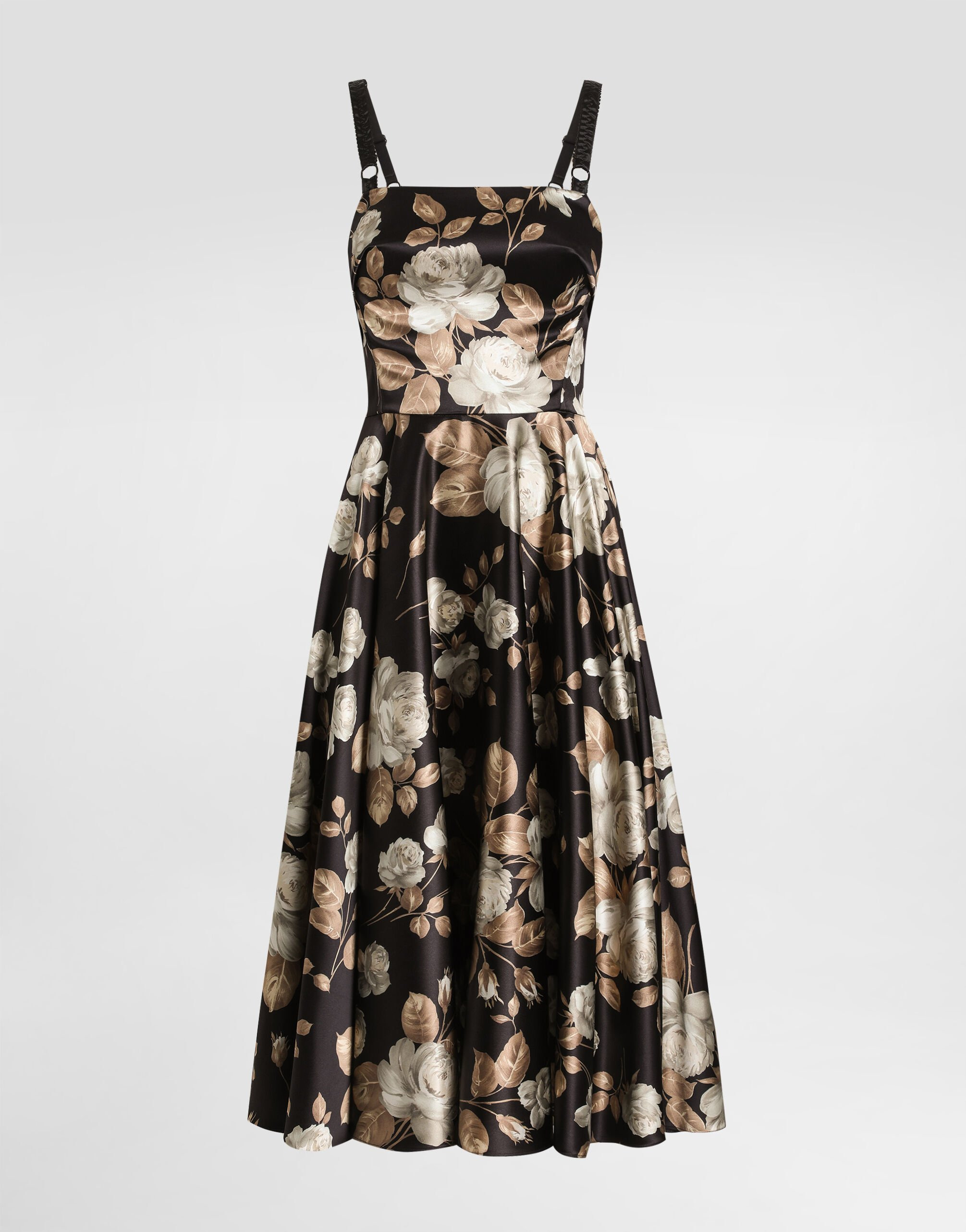 This stretch viscose satin dress is perfect for an elegant event. With the Vintage rose print, it offers a touch of romance and femininity, ideal for special occasions. Vintage rose-print satin dress: • Multi-colored • Bodice with double ring straps • Lined and boned bodice • Skirt length 75 cm on size 40 IT • The model is 175 cm tall and wears size 40 IT • Made in Italy The difference in the print placement that you may find on this product is a feature of Dolce&Gabbana’s “Handmade” pieces. A detail that makes every garment or accessory unique and exclusive. External Composition: 91% Viscose, 5% Silk, 4% Elastane Internal Composition: 93% Silk, 7% Elastane