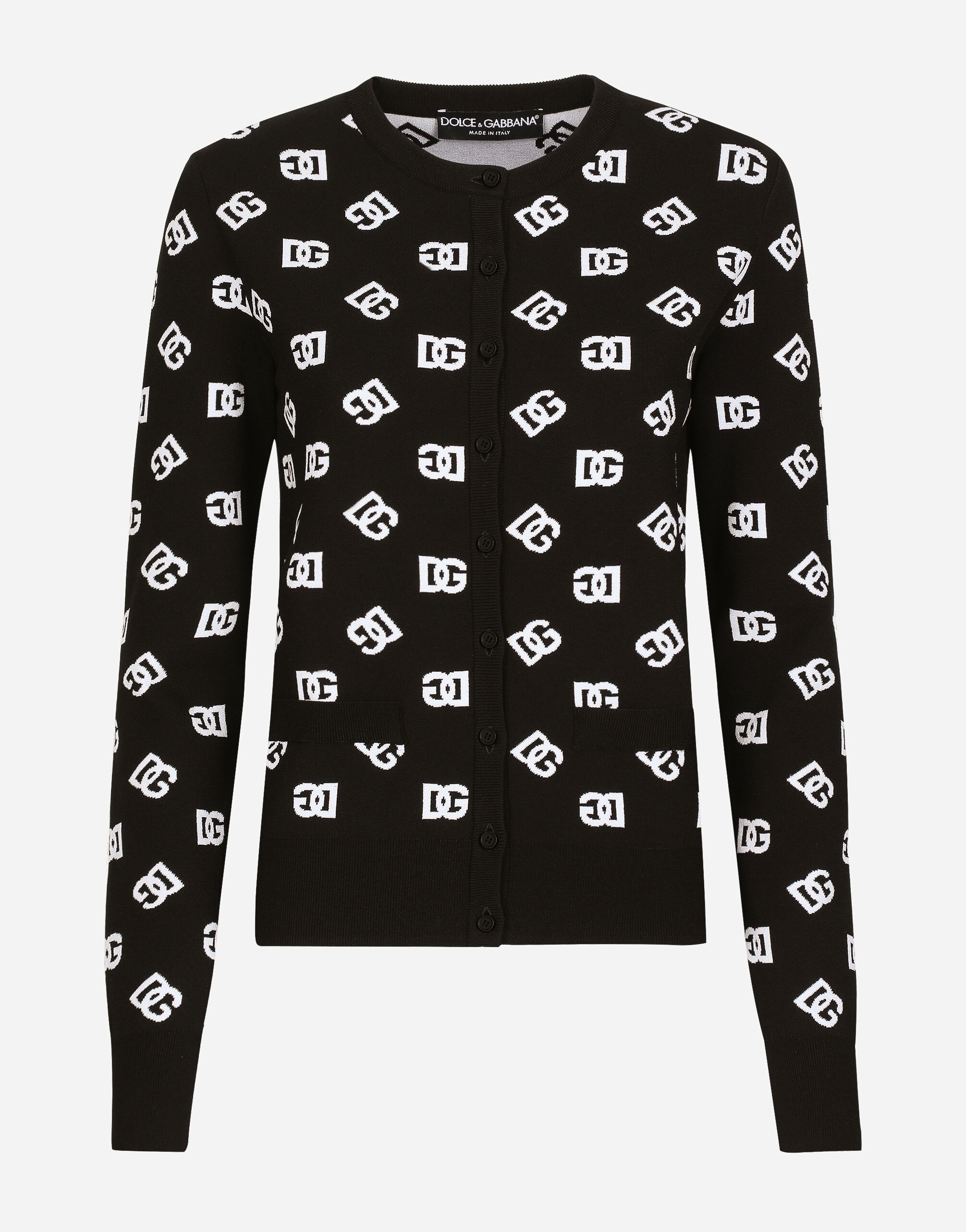 The DNA collection is distinguished by timeless shapes, bringing together three concepts: Sicilian flair, tailoring and sensuality. Nero Sicilia black and optical white predominate and pair with colors that catapult us onto the island of Sicily and make us dream. The designers channel the timeless wardrobe made up of creations that are instantly unmistakable in their simplicity, presenting us with sophisticated beauty loaded with meaning and symbolism that transcends fashion. Viscose cardigan with all-over jacquard DG logo: • Black • 18-gauge knit • Round neck • Long sleeves • French seam armholes • Dense hand • Ribbed neck and hem • Regular fit • Logo-detailed button fastenings • The piece measures 58 cm from the shoulder seam on a size IT 40 • The model is 175 cm tall and wears a size IT 40 • Made in Italy External composition: 83% Viscose 17% Polyester
