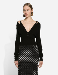 The FW24/25 Mambo Collection is rewriting the rules of Italian elegance, merging the sophisticated style of the 1940s and 1950s with the iconography of American pin-ups. The unmistakable polka-dot motif takes center stage, coming in a variety of shapes and sizes and adorning tulle, charmeuse, twill, silk and poplin, giving life to looks distinguished by black and white accessories and details. An homage to the beauty of Italy and its traditions, the distinctive details of Dolce&Gabbana’s creations. Viscose-knit vest top: • Black • 14-gauge knit • V-neck • Sleeveless • Cropped fit • The piece measures 45 cm from the shoulder seam on a size IT 40 • The model is 175 cm tall and wears a size IT 40 • Made in Italy External composition: 71% Viscose 15% Polyester 8% Polyamide 6% Spandex