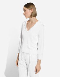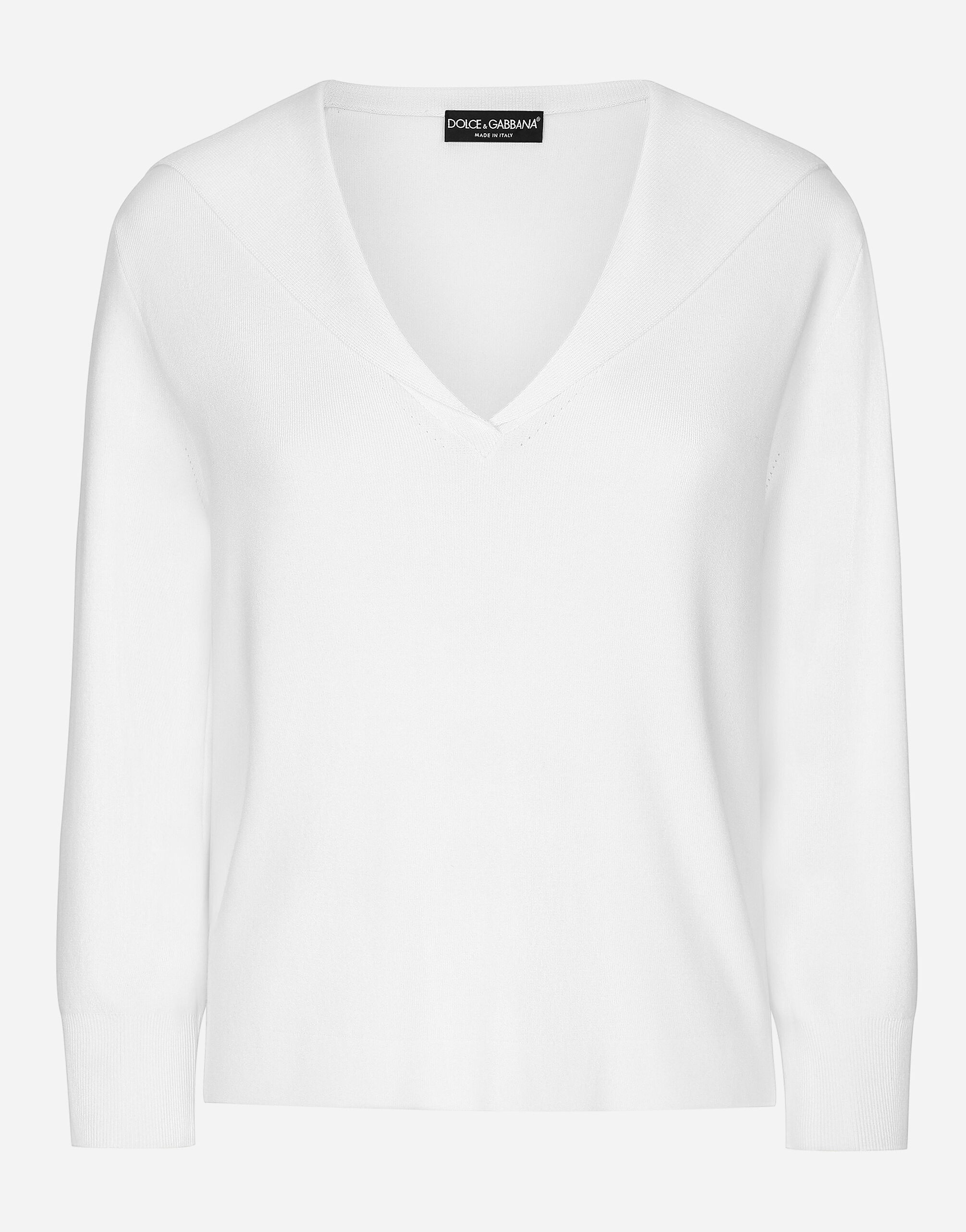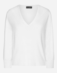 The Italian summers of the 1960s, the candid purity of white, the sophisticated elegance of the jet set of that era. The imagery of the FW24/25 Capri Collection encapsulates all this flawlessly. The pieces range from floaty poplin silhouettes or sack-style dresses and skirts, to brocade outerwear and floral-inlay fabric shirts. The iconic bags – the Logo Bag, the Sicily Bag and the Dolce Box – complement the looks, while the shoes come embroidered with designs inspired by the crystal-clear sea of Capri. Viscose sweater with sailor collar: • White • 18-gauge knit • V-neck • Long sleeves • Regular fit • The piece measures 55 cm from the shoulder seam on a size IT 40 • The model is 175 cm tall and wears a size IT 40 • Made in Italy External composition: 58% Viscose 42% Cotton