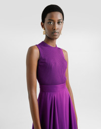 This sleeveless tank top is a wardrobe staple for any woman, perfect for wearing on its own or as a base layer under jackets and cardigans. The simple and modern design easily adapts to multiple styles, making it a must-have for any season. Viscose tank top: • Purple • Crew neck • Sleeveless • The model is 175 cm tall and wears size 40 IT • Made in Italy External Composition: 47% Polyamide, 41% Viscose, 9% Polyester, 3% Polyurethane