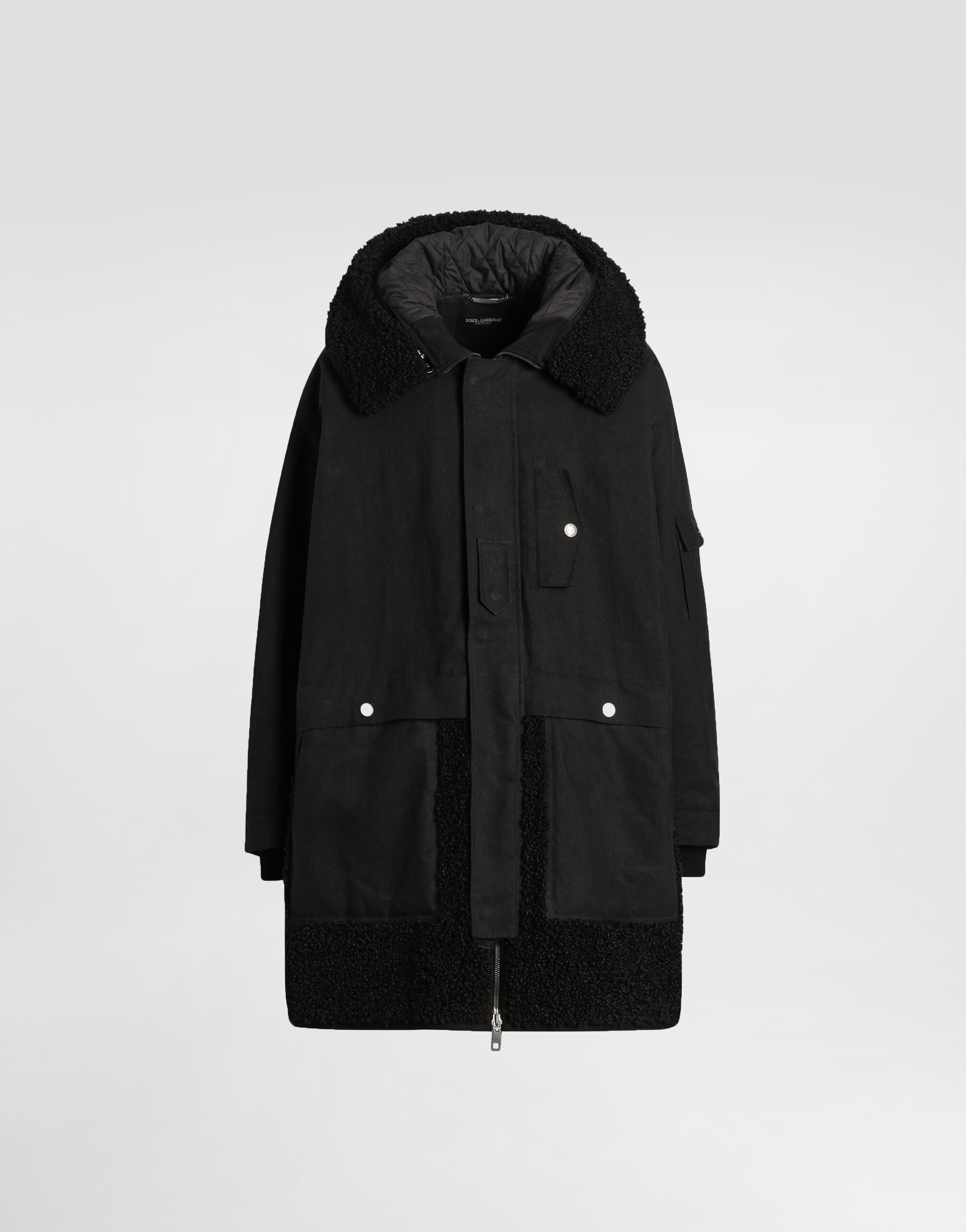 This down jacket is a versatile and functional piece that is perfect for the modern men's wardrobe. With its refined design and practical details, it is ideal for facing the coldest days in style. Waxed long down jacket: • Black • Hood with detachable teddy trim • With front and side zips • Lined • The model is 185 cm tall and wears size 48 IT • Made in Italy External Composition: 39% Cotton, 35% Polyamide, 26% Polyester