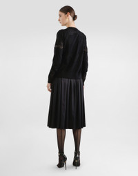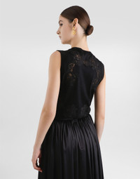 This virgin wool tank top is the epitome of sophisticated simplicity, perfect for any women's wardrobe. With a sleeveless design and lace workmanship, it offers a touch of timeless elegance. Wool and lace tank top: • Black • Crew neck • Sleeveless • The model is 175 cm tall and wears size 40 IT • Made in Italy External Composition: 60% Virgin Wool, 32% Cotton, 8% Polyamide
