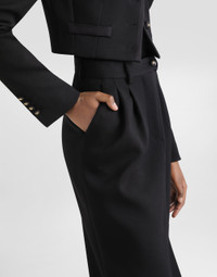 The Women's Black Sicily Collection reinforces Dolce&Gabbana's iconic fabrics and codes rooted in Italian heritage. Sensual silhouettes, highlighted by floral prints and refined corsetry, evoke an intriguing elegance, while the iconic black lace, satin, and velvet dominate the collection. Denim in various shades of blue introduces a contemporary twist, balancing the classic and modern. Embroidered crosses, medals, and jewelry add a sophisticated touch. Wool calf-length pencil skirt: • Black • High-waisted • Welt back pockets with DG logo buttons • Front slit • Unlined • Front zipper and DG logo button fastening • The piece measures 75 cm from the waist down on a size IT 40 • The model is 175 cm tall and wears a size IT 40 • Made in Italy External composition: 100% Virgin Wool
