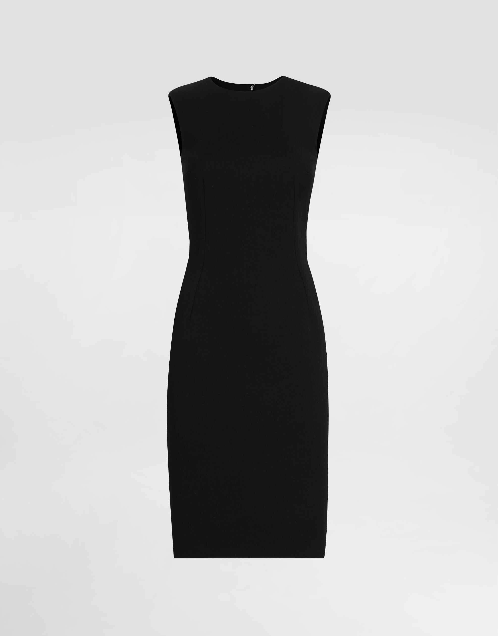 The Women's Black Sicily Collection reinforces Dolce&Gabbana's iconic fabrics and codes rooted in Italian heritage. Sensual silhouettes, highlighted by floral prints and refined corsetry, evoke an intriguing elegance, while the iconic black lace, satin, and velvet dominate the collection. Denim in various shades of blue introduces a contemporary twist, balancing the classic and modern. Embroidered crosses, medals, and jewelry add a sophisticated touch. Wool gabardine calf-length sheath dress: • Black • Round neck • Sleeveless • Stretch silk satin lining • Rear zipper and hook-and-bar fastening • The piece measures 60 cm from the waist down on a size IT 40 • The model is 175 cm tall and wears a size IT 40 • Made in Italy External composition: 100% Virgin Wool Internal composition: 92% Silk 08% Spandex