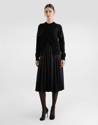 This cardigan represents the essence of timeless elegance, with a touch of femininity thanks to the lace insert. Perfect for any occasion, it combines comfort and style in a single garment. Wool cardigan with lace: • Black • Long sleeves • Button closure • Bottom width 60 cm on size 40 IT • The model is 175 cm tall and wears size 40 IT • Made in Italy External Composition: 70% Virgin Wool, 24% Cotton, 6% Polyamide