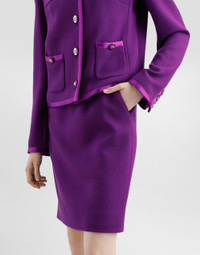 The Everyday Women's Collection reimagines contemporary daily wear with Dolce&Gabbana's signature style codes. Iconic fabrics mix with standout details like embroidered flowers, crystals, and jewel buttons, infusing elegance into every look. Gray animal print accented with green and purple, hyper-geometric jewelry, voluminous shapes and transparencies add unique touches. Men's tweed is reinvented with graphic twists, creating distinctive pieces that reflect refined sensuality. Double wool crepe midi pencil skirt with duchesse waistband: • Purple • High-waisted • Silk satin lining • Rear zipper and hook-and-bar fastening • The piece measures 55 cm from the waist down on a size IT 40 • The model is 175 cm tall and wears a size IT 40 • Made in Italy External composition: 90% Wool 08% Silk 02% Polyester Internal composition: 100% Silk