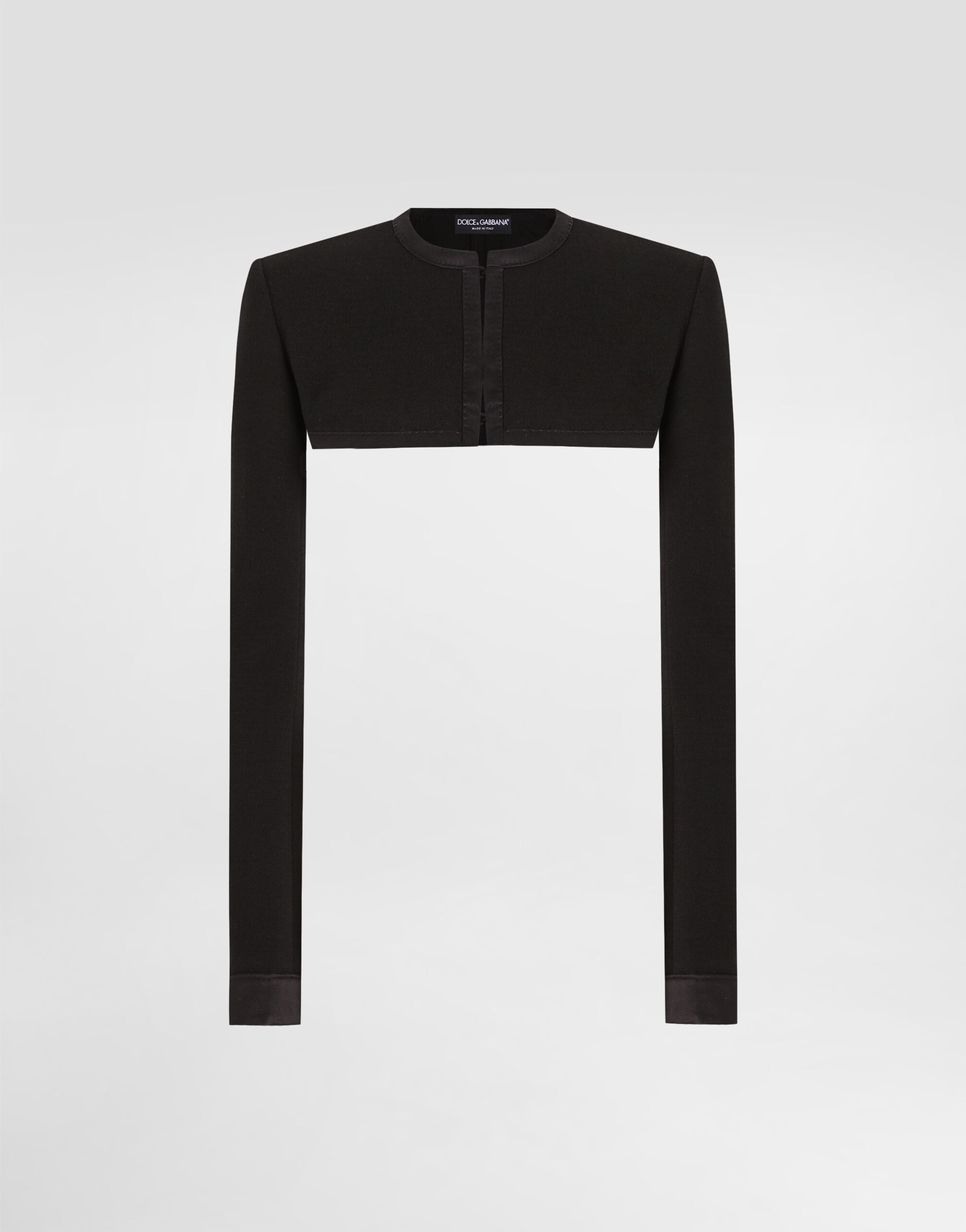 The Spring/Summer 2025 Women’s Collection is celebrating Italian beauty through bold and charismatic femininity. The 50s-inspired lingerie is the star, intermingling with fitted dresses, corsets and oversize trench coats. The iconic jackets have been updated with cropped cuts and modern inserts, while the floral prints add a romantic edge. The eveningwear shines with light fabrics and crystals, accompanied by look-defining accessories, from iconic bags to the cross earrings. Double stretch wool crepe shrug: • Black • Round neck • Long sleeves • Tulle lining • Hook-and-eye fastening • The piece measures 26 cm from the center back on a size IT 40 • The model is 175 cm tall and wears a size IT 40 • Made in Italy External composition: 83% Virgin Wool 11% Silk 3% Polyester 2% Polyamide 1% Spandex Internal composition: 90% Polyamide 7% Acetate 3% Silk