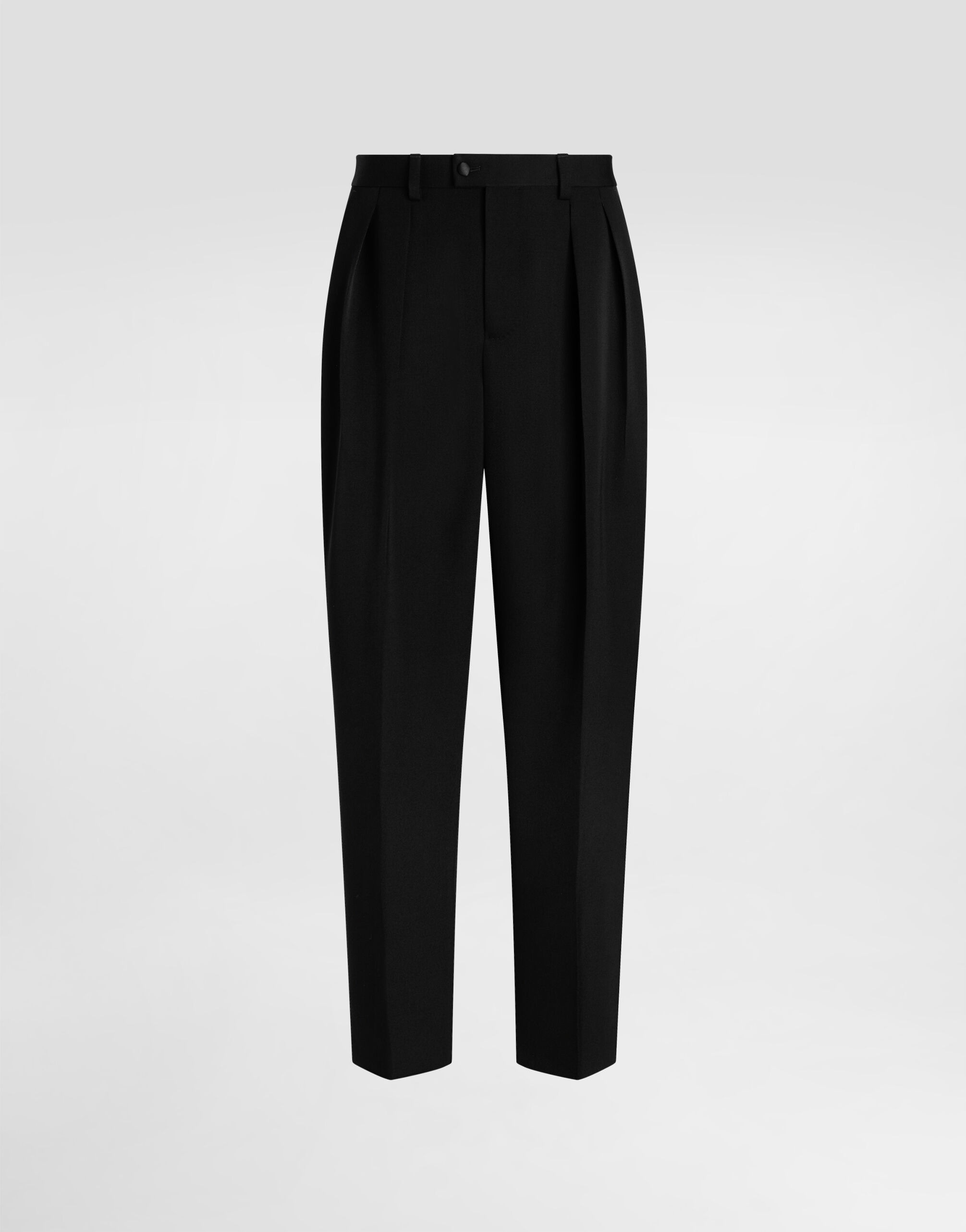 The scene is set for Dolce&Gabbana's distinctive and iconic aesthetic codes in the Collection from Men's Fall/Winter 2025 Fashion Show. The evening lights up with radiant brooches and is enriched with classic suits and blazers of timeless elegance. These elegant wool gabardine trousers are the perfect choice for a sophisticated and modern look, ideal for any occasion. Wool gabardine trousers: • Black • Folds towards the center front • Wide hem • The model is 185 cm tall and wears a size 48 IT • Made in Italy External Composition: 100% Wool