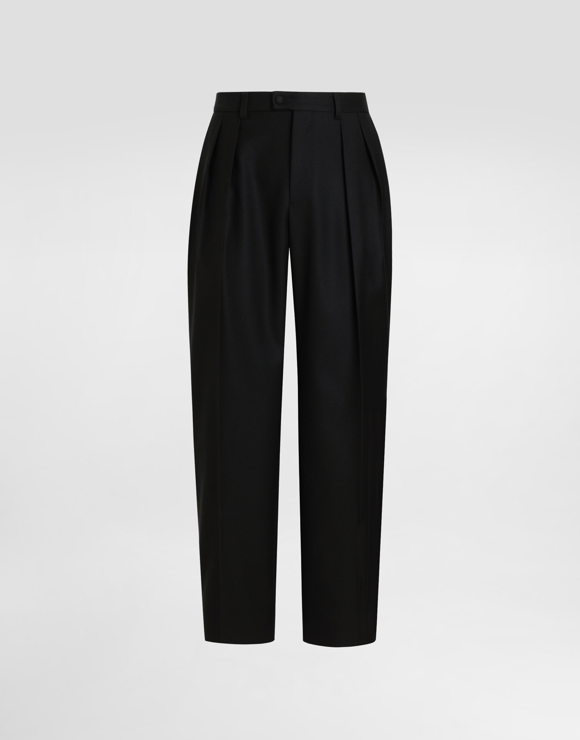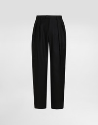 The scene is set for Dolce&Gabbana's distinctive and iconic aesthetic codes in the Collection from Men's Fall/Winter 2025 Fashion Show. The evening lights up with radiant brooches and is enriched with classic suits and blazers of timeless elegance. These trousers are perfect for the man looking for elegance and comfort in a versatile and refined garment. Wool gabardine trousers: • Black • Folds towards the center front • Wide hem • The model is 185 cm tall and wears a size 48 IT • Made in Italy External Composition: 100% Wool