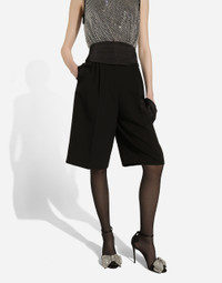 Menswear and womenswear mix and mingle, influencing one another and creating tailoring that embraces endless nuances, from the boldest to the most sophisticated, to define the rules of eternally classy femininity. A monochrome retelling in Nero Sicilia black, embellished by golden touches and rhinestones, adorning clean lines and incorporating stylish fabrics such as velvet, chiffon, lace, organza, and unique mesh details, the expression of authentic beauty for dresses, shirts and accessories. Wool gabardine tuxedo Bermuda shorts: • Black • High-waisted • Double darts • Front slant pockets • Welt back pockets • Inner leg: 30 cm • Hem: 31 cm • Zipper and button fastening • The model is 175 cm tall and wears a size IT 40 • Made in Italy External composition: 89% Virgin Wool 09% Silk 02% Polyester