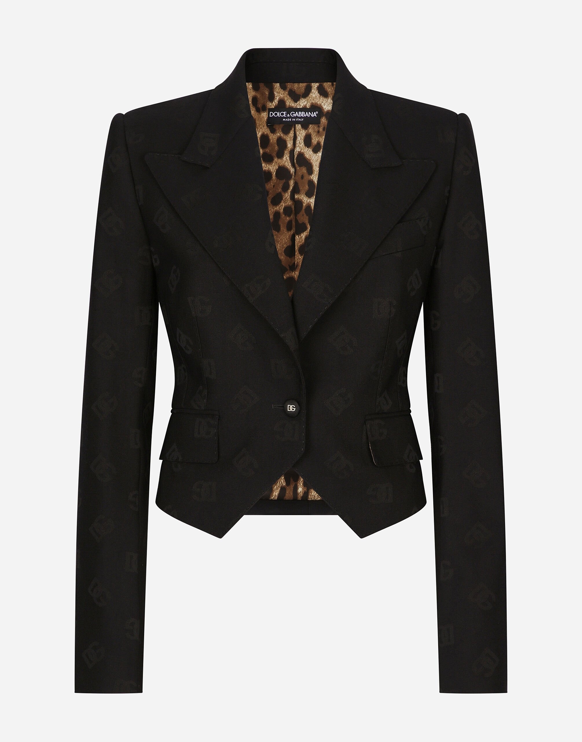 The DNA collection is distinguished by timeless shapes, bringing together three concepts: Sicilian flair, tailoring and sensuality. Nero Sicilia black and optical white predominate and pair with colors that catapult us onto the island of Sicily and make us dream. The designers channel the timeless wardrobe made up of creations that are instantly unmistakable in their simplicity, presenting us with sophisticated beauty loaded with meaning and symbolism that transcends fashion. Wool jacquard Spencer jacket with DG logo: • Black • Peak lapels • Long sleeves • Flap pockets • Leopard-print stretch satin lining • Canneté-covered button fastening and DG logo • The piece measures 48 cm from the center back on a size IT 40 • The model is 175 cm tall and wears a size IT 40 • Made in Italy External composition: 65% Wool 35% Virgin wool Internal composition: 97% Polyester 3% Spandex