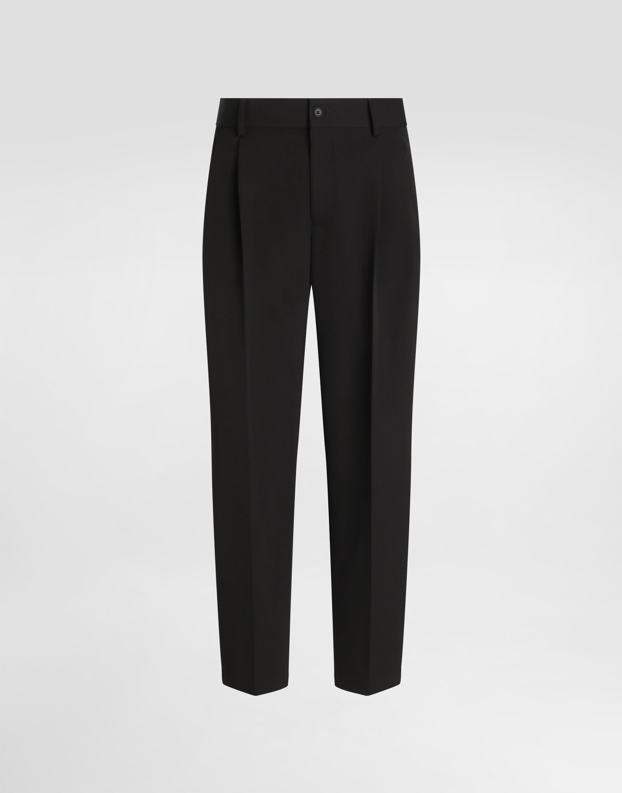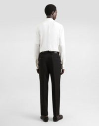 The Italian Holiday Men's Collection revisits 1950s style with a blend of relaxed fits and modern flair. Classic white shirts and tailored suits in refined fabrics contrast with casual denim and playful T-shirts featuring retro graphics with a futuristic twist. Bold prints—chessboards, cats, elegant lighters, and Mediterranean blue ribbons—alongside logo jacquard inspired by ties, infuse a contemporary edge into the essence of Italian holidays. Tailored wool gabardine pants: • Black • Regular fit • Belt loops on the waist • Fly-covered zipper and button fastening • Double darts • Front slant pockets, a coin pocket, and buttoned welt pockets on the back • The item measures 99 cm on the outer leg and the hem is 18 cm wide on a size IT 48 • Made in Italy External composition: 97% Virgin Wool 3% Spandex