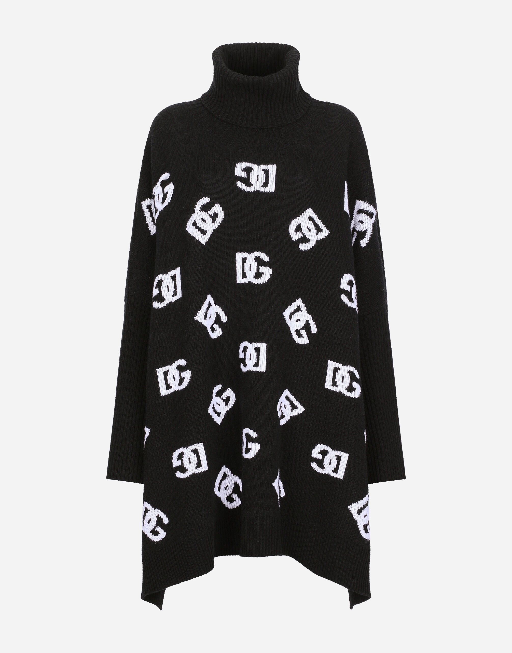 The DNA collection is distinguished by timeless shapes, bringing together three concepts: Sicilian flair, tailoring and sensuality. Nero Sicilia black and optical white predominate and pair with colors that catapult us onto the island of Sicily and make us dream. The designers channel the timeless wardrobe made up of creations that are instantly unmistakable in their simplicity, presenting us with sophisticated beauty loaded with meaning and symbolism that transcends fashion. Wool poncho with all-over jacquard DG logo: • Black • 12-gauge knit • Ribbed neck and sleeves • High neck • Long sleeves • Side slits • Oversize fit • The piece measures 80 cm from the shoulder seam on a size IT 40 • The model is 175 cm tall and wears a size IT 40 • Made in Italy External composition: 99% Virgin Wool 1% Polyamide