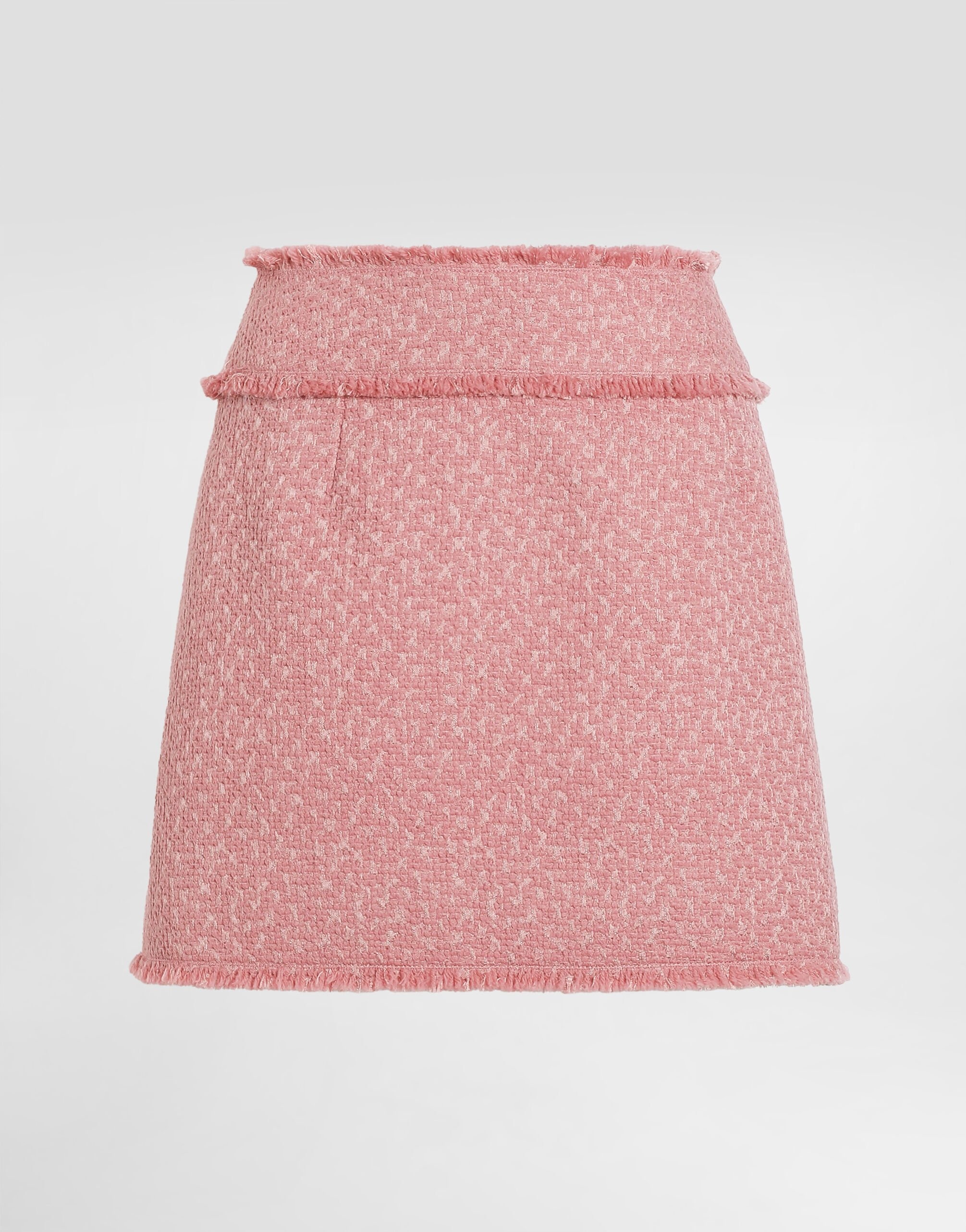 The Women’s DNA Collection is introducing a new side to femininity, which comes in shades of rose quartz, poised between sheerness and opacity, lightness and structure, formality and sensuality. Geometric Dolce Jackets, jacquard pajamas and floral brocade dresses intertwine with ultra-romantic designs. The DG print becomes an iconic statement, while Cordonetto lace and hints of Sicily Black embody the essence of a determined yet romantic femininity. A-line wool raschel tweed miniskirt: • Pink • Regular rise • A-line • Tonal stretch silk satin lining • Rear zipper and hook-and-eye fastening • The piece measures 40 cm from the waist down on a size IT 40 • The model is 175 cm tall and wears a size IT 40 • Made in Italy External composition: 67% Virgin Wool 27% Viscose 06% Polyamide Internal composition: 92% Silk 08% Spandex