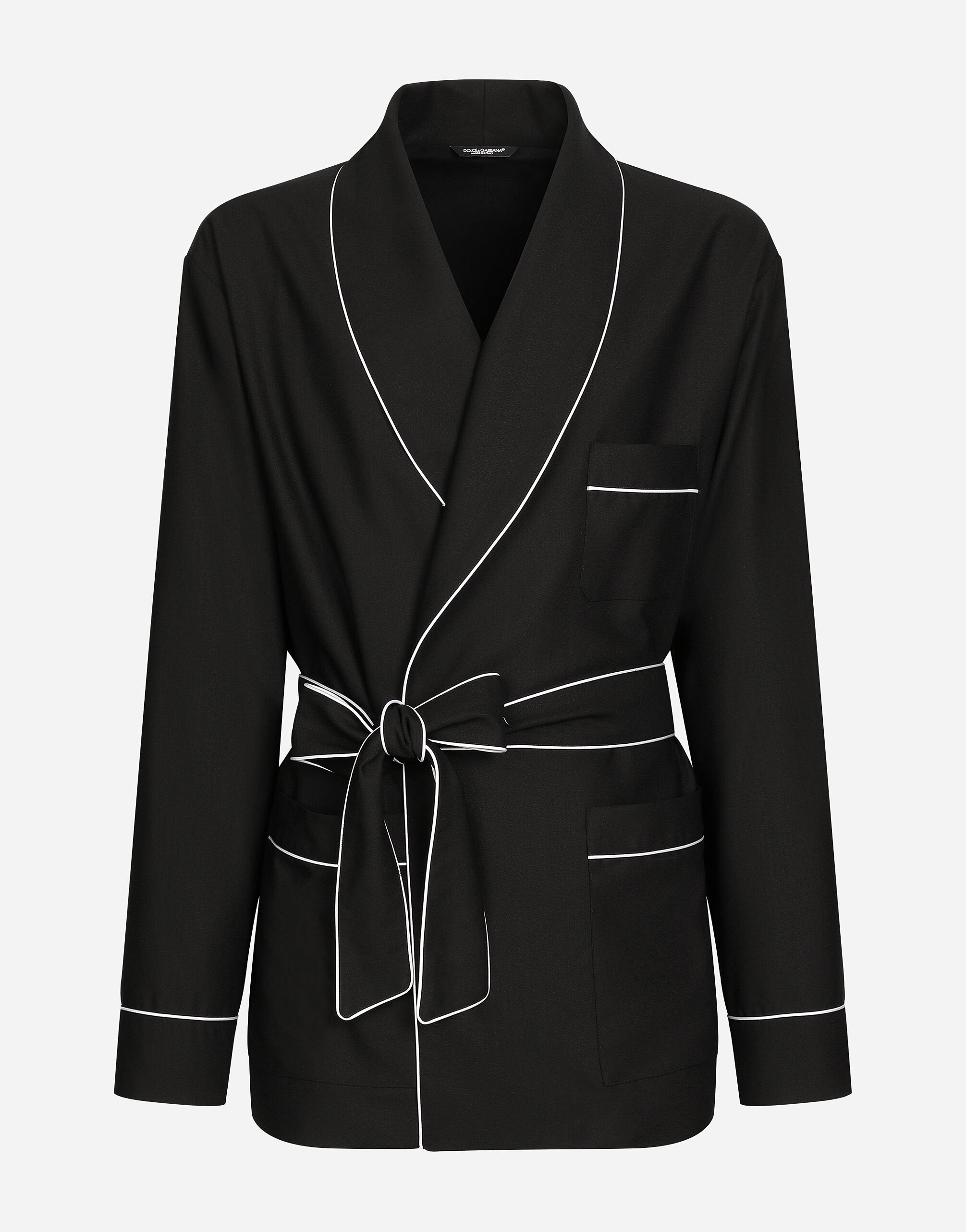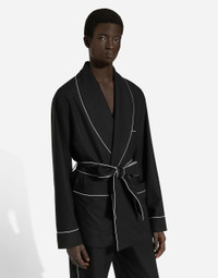 Contemporary men’s formalwear: The FW 24/25 Dolce&Gabbana Men’s Collection is embracing the concept of absolute elegance dominated by the iconic Nero Sicilia black. The daywear of the Dolce&Gabbana man comes to life through the outerwear that comes in a range of lengths and the slim-fit pants. For nightwear, the look becomes scintillating thanks to sequined embellishment and stone appliques. This refined taste can also be seen on the accessories, such as on the slip-ons with hand-applied organza flower accent and the new clutch. Wool robe with piping: • Black • Shawl lapels • Wrap fastening with belt • Front patch pockets • Lined • The piece measures 81 cm from the rear collar seam on a size IT 48 • Made in Italy External composition: 100% Virgin Wool Internal Composition: 100% Polyester