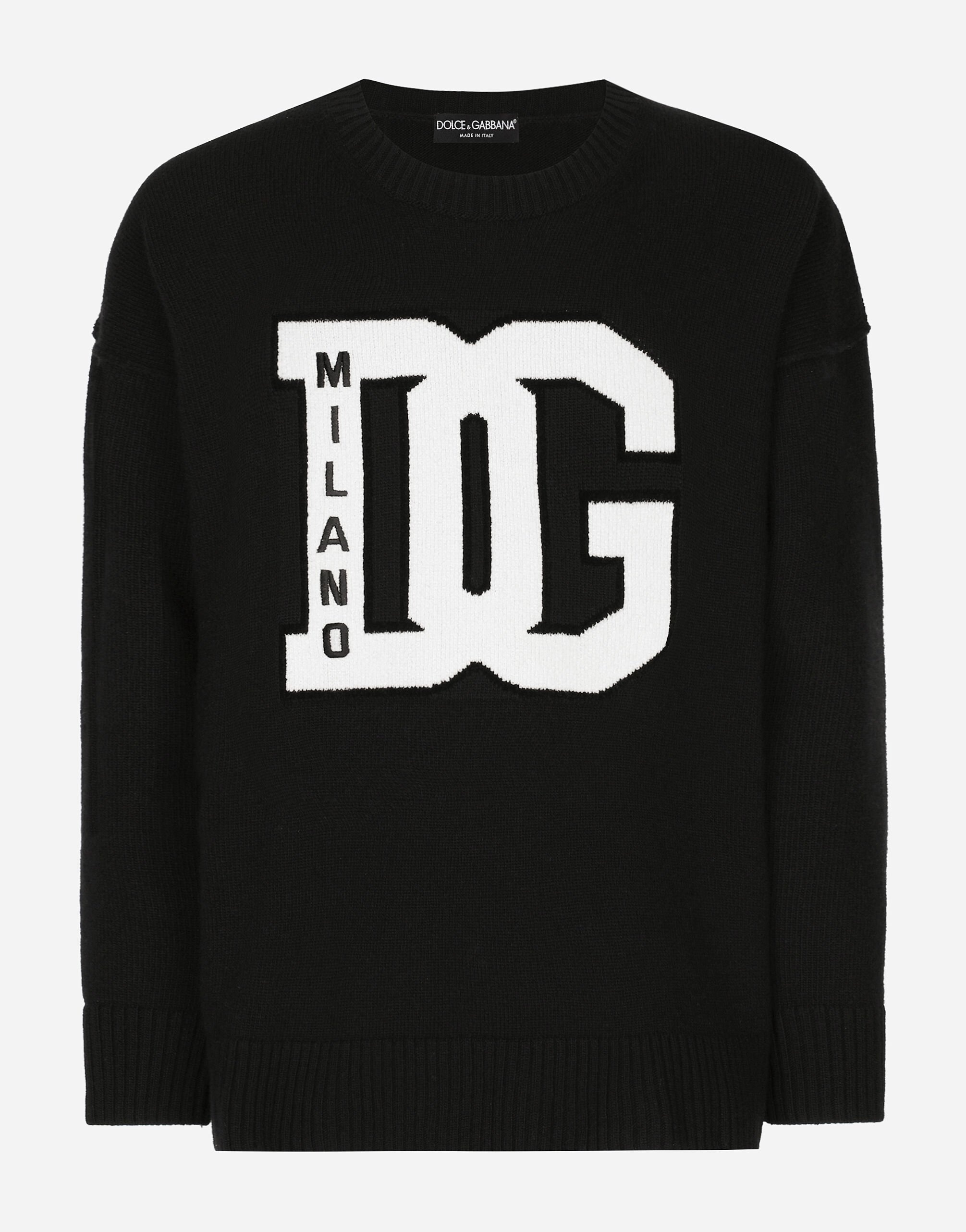 The men's FW 24-25 Re-Edition collection conveys contemporary style that flaunts all the power of the creative DNA that consolidated the brand's image and elevated it to iconic status in the 2000s. Raw-cut details and skilled finishes distinguish pieces with streetwear character: military-inspired jackets and maxi-coats, multi-pocket cargo pants and picot pieces alternate with denim boasting many washes and dyes, thereby redefining an iconic style that is always evolving. Wool round-neck sweater with DG logo inlay: • Black • Oversize fit • Long sleeves • 7-gauge plain knit • The piece measures 70 cm from the shoulder seam on a size M IT • Made in Italy External composition: 93% Virgin Wool 3% Cotton 4% Viscose