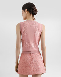 The Women’s DNA Collection is introducing a new side to femininity, which comes in shades of rose quartz, poised between sheerness and opacity, lightness and structure, formality and sensuality. Geometric Dolce Jackets, jacquard pajamas and floral brocade dresses intertwine with ultra-romantic designs. The DG print becomes an iconic statement, while Cordonetto lace and hints of Sicily Black embody the essence of a determined yet romantic femininity. Wool tank top with lace inlay: • Pink • 18-gauge knit • Round neck • Sleeveless • Ribbed neck and hem • Regular fit • The piece measures 60 cm from the shoulder seam on a size IT 40 • The model is 175 cm tall and wears a size IT 40 • Made in Italy External composition: 60% Virgin Wool 32% Cotton 8% Polyamide