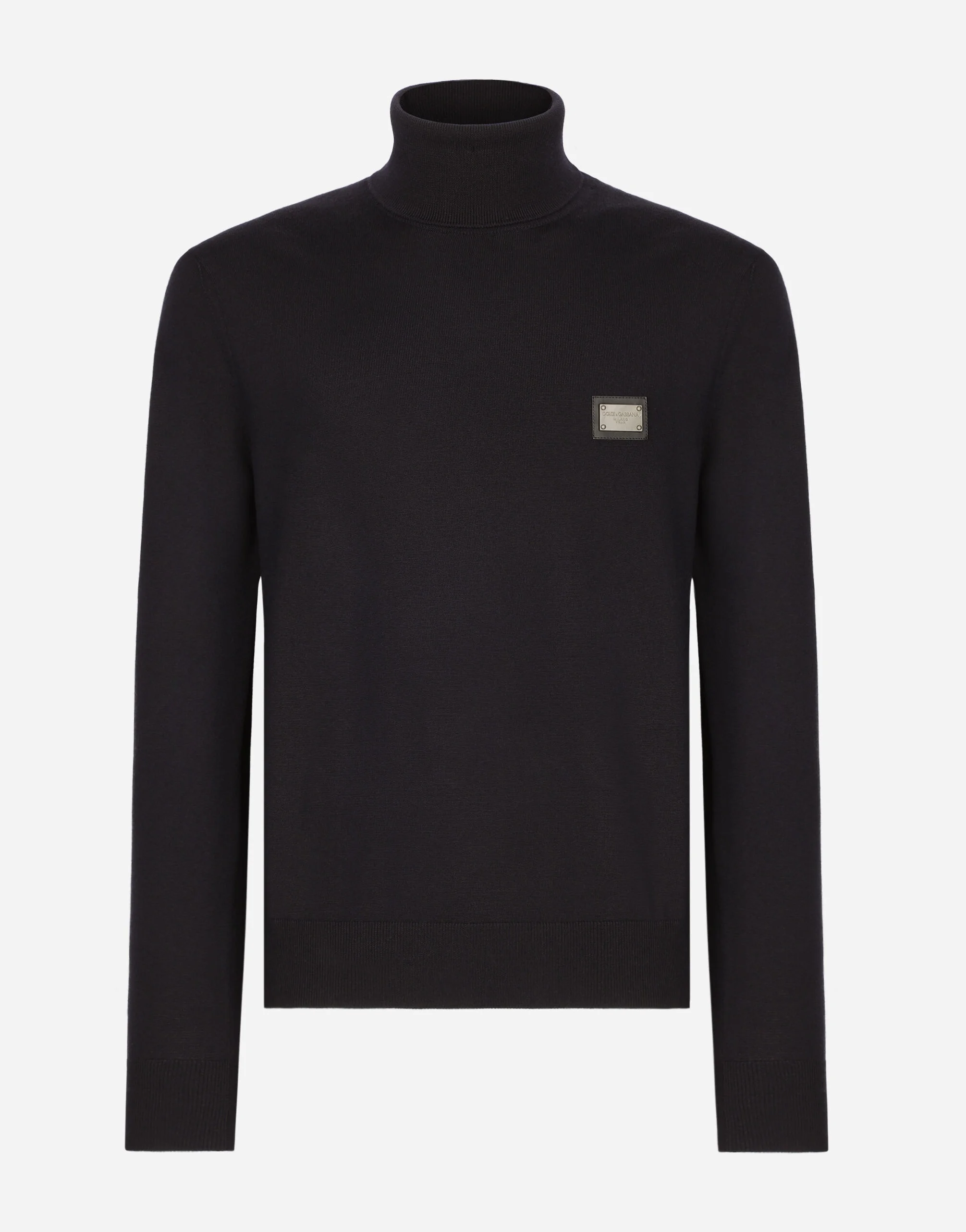 Turtle-neck wool sweater with metal tag featuring the Dolce&Gabbana logo: • Blue •Regular fit •14-gauge plain knit •The piece measures 68 cm from the shoulder seam on a size IT 48 •The model is 185 cm tall and wears a size IT 48 •Made in Italy Care And Details External composition: 100% Wool